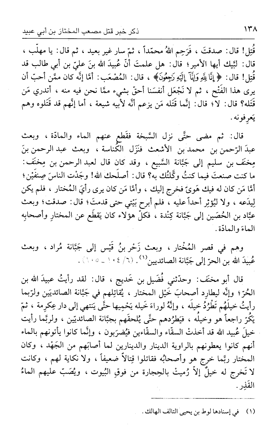 قال: ثم مضى حتَّى نزل السَّبخة فقَطع عنهم الماء والمادّة، وبعث عبدَ الرّحمن بن محمد بن الأشعث فنَزَل الكناسة، وبعث عبد الرحمن بنَ مِخنَف بن سليم إلى جَبَّانة السَّبيع، وقد كان قال لعبد الرحمن بن مِخنَف: ما كنت صنعتَ فيما كنتُ وكَّلتُك به؟ قال: أصلَحك الله! وجَدْت الناسَ صِنفَيْن؛ أمَّا مَن كان له فيك هَوىً فخرج إليك، وأمَّا مَن كان يرى رأيَ المُختار، فلم يكن لِيدَعه، ولا ليُؤثِر أحدًا عليه، فلم أبرح بَيْتي حتى قدمتَ؛ قال: صدقت، وبعث عبَّاد بن الحُصَين إلى جَبَّانة كِنْدة، فكلّ هؤلاء كان يَقطَع عن المختارِ وأصحابِه الماءَ والمادّة.