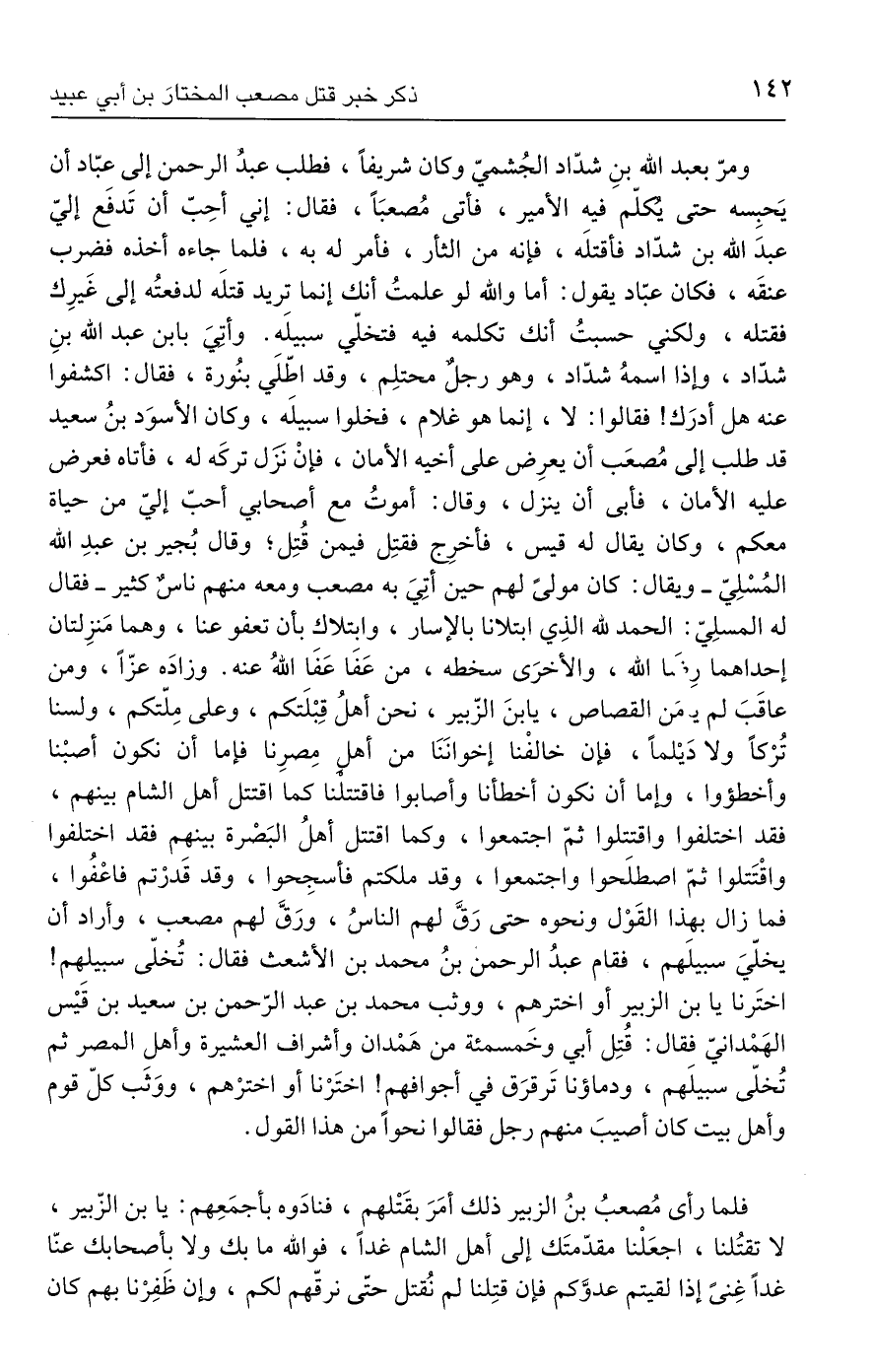 ومرّ بعبد الله بنِ شدّاد الجُشميّ وكان شريفًا، فطلب عبدُ الرحمن إلى عبّاد أن يَحبِسه حتى يكلّم فيه الأمير، فأتى مُصعبًا، فقال: إني أحِبّ أن تَدفَع إليّ عبدَ الله بن شدّاد فأقتلَه، فإنه من الثأر، فأمر له به، فلما جاءه أخذه فضرب عنقَه، فكان عبّاد يقول: أما والله لو علمتُ أنك إنما تريد قتلَه لدفعتُه إلى غَيرِك فقتله، ولكني حسبتُ أنك تكلمه فيه فتخلّي سبيلَه. وأتيَ بابن عبد الله بنِ شدّاد، وإذا اسمهُ شدّاد، وهو رجلٌ محتلِم، وقد اطّلَي بنُورة، فقال: اكشفوا عنه هل أدرَك! فقالوا: لا، إنما هو غلام، فخلوا سبيلَه، وكان الأسوَد بنُ سعيد قد طلب إلى مُصعَب أن يعرِض على أخيه الأمان، فإنْ نزَل تركَه له، فأتاه فعرض عليه الأمان، فأبى أن ينزل، وقال: أموتُ مع أصحابي أحبّ إليّ من حياة معكم، وكان يقال له قيس، فأخرِج فقتِل فيمن قُتِل؛ وقال بُجير بن عبدِ الله المُسْلِيّ - ويقال: كان مولىً لهم حين أتِيَ به مصعب ومعه منهم ناسٌ كثير - فقال له المسلِيّ: الحمد لله الذِي ابتلانا بالإسار، وابتلاك بأن تعفو عنا، وهما مَنزِلتان إحداهما رِضَا الله، والأخرَى سخطه، من عَفَا عَفَا اللهُ عنه. وزادَه عزًّا، ومن عاقَبَ لم يأمَن القصاص، يابنَ الزّبير، نحن أهلُ قِبْلَتكم، وعلى مِلّتكم، ولسنا تُرْكًا ولا دَيْلمًا، فإن خالفْنا إخوانَنَا من أهل مِصرِنا فإما أن نكون أصبْنا وأخطؤوا، وإما أن نكون أخطأنا وأصابوا فاقتتلنا كما اقتتل أهل الشام بينهم، فقد اختلفوا واقتتلوا ثمّ اجتمعوا، وكما اقتتل أهلُ البَصْرة بينهم فقد اختلفوا واقْتَتلوا ثمّ اصطلَحوا واجتمعوا، وقد ملكتم فأسجِحوا، وقد قَدرْتم فاعْفُوا، فما زال بهذا القَوْل ونحوه حتى رَقَّ لهم الناسُ، ورَقَّ لهم مصعب، وأراد أن يخلّيَ سبيلَهم، فقام عبدُ الرحمن بنُ محمد بن الأشعث فقال: تُخلّى سبيلهم! اختَرنا يا بن الزبير أو اخترهم، ووثب محمد بن عبد الرّحمن بن سعيد بن قَيْس الهَمْدانيّ فقال: قُتِل أبي وخَمسمئة من هَمْدان وأشراف العشيرة وأهل المصر ثم تُخلّى سبيلَهم، ودماؤنا تَرقرَق في أجوافهم! اختَرْنا أو اخترْهم، ووَثَب كلّ قوم وأهل بيت كان أصيبَ منهم رجل فقالوا نحوًا من هذا القول.