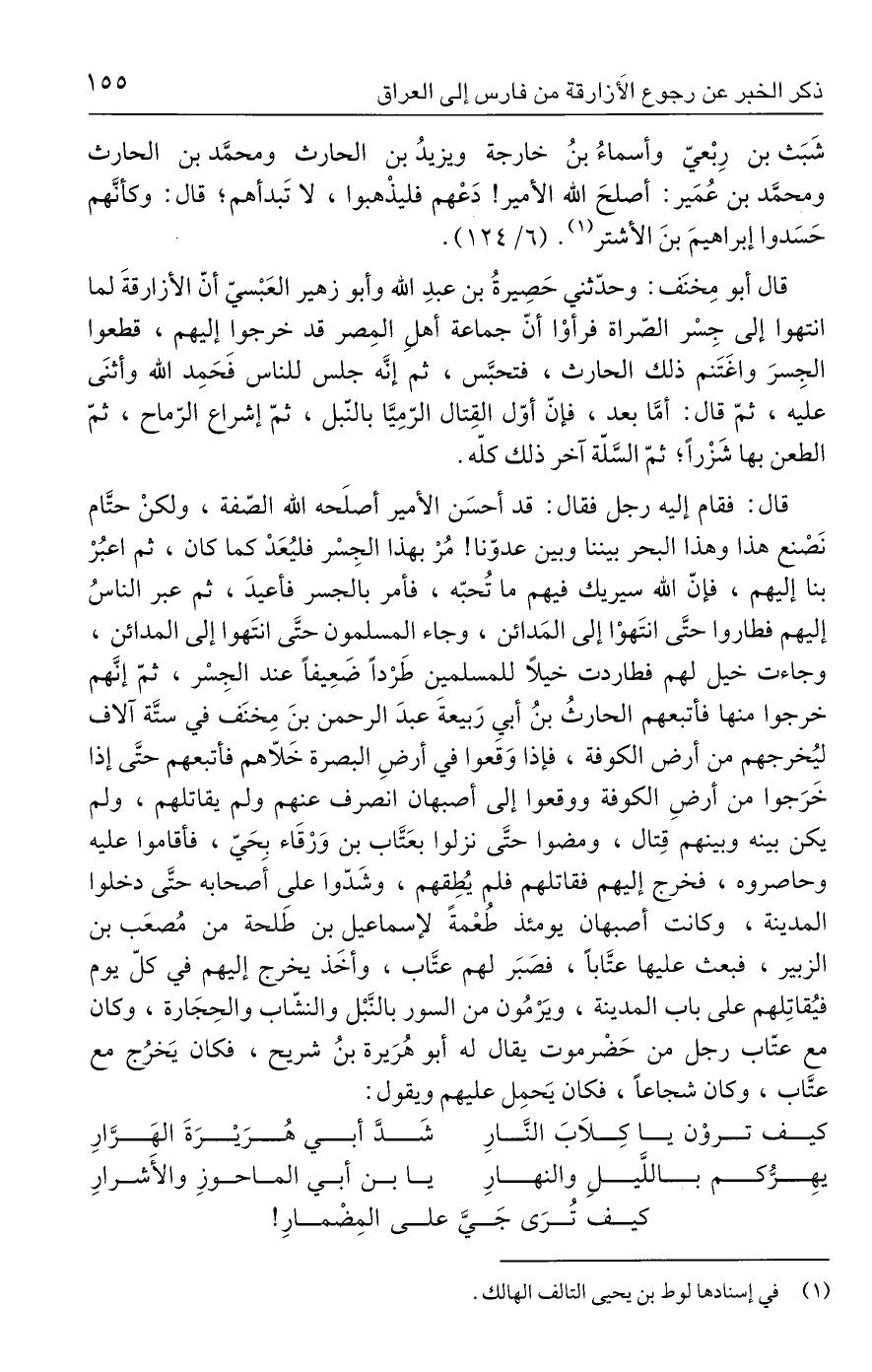 قال: فقام إليه رجل فقال: قد أحسَن الأمير أصلَحه الله الصّفة، ولكنْ حتَّام نَصْنع هذا وهذا البحر بيننا وبين عدوّنا! مُرْ بهذا الجِسْر فليُعَدْ كما كان، ثم اعبُرْ بنا إليهم، فإنّ الله سيريك فيهم ما تُحبّه، فأمر بالجسر فأعيدَ، ثم عبر الناسُ إليهم فطاروا حتَّى انتَهوْا إلى المَدائن، وجاء المسلمون حتَّى انتَهوا إلى المدائن، وجاءت خيل لهم فطاردت خيلًا للمسلمين طَرْدًا ضَعِيفًا عند الجِسْر، ثمّ إنَّهم خرجوا منها فأتبعهم الحارثُ بنُ أبي رَبيعةَ عبدَ الرحمن بنَ مِخنَف في ستَّة آلاف ليُخرجهم من أرض الكوفة، فإذا وَقَعوا في أرضِ البصرة خَلّاهم فأتبعهم حتَّى إذا خَرَجوا من أرضِ الكوفة ووقعوا إلى أصبهان انصرف عنهم ولم يقاتلهم، ولم يكن بينه وبينهم قِتال، ومضوا حتَّى نزلوا بعَتَّاب بن وَرْقَاء بحَيّ، فأقاموا عليه وحاصروه، فخرج إليهم فقاتلهم فلم يُطِقهم، وشَدّوا على أَصحابه حتَّى دخلوا المدينة، وكانت أصبهان يومئذ طُعْمةً لإسماعيل بن طَلحة من مُصعَب بن الزبير، فبعث عليها عتَّابًا، فصَبَر لهم عتَّاب، وأخَذ يخرج إليهم في كلّ يوم فيُقاتِلهم على باب المدينة، ويَرْمُون من السور بالنَّبْل والنشّاب والحِجَارة، وكان مع عتّاب رجل من حَضرموت يقال له أبو هُرَيرة بنُ شريح، فكان يَخرُج مع عتَّاب، وكان شجاعًا، فكان يَحمِل عليهم ويقول:
