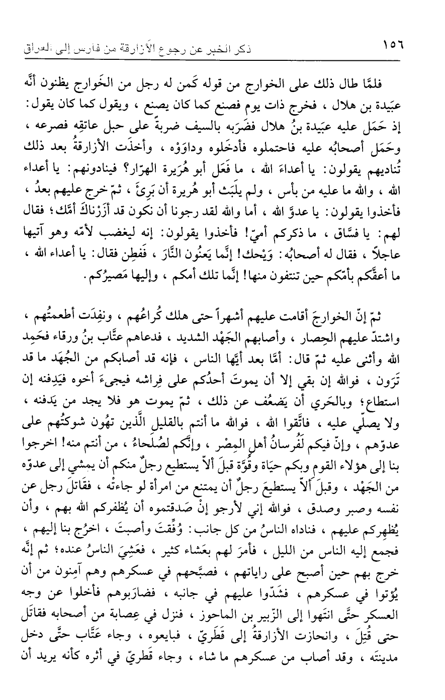 ثمّ إنّ الخوارجَ أقامت عليهم أشهرًا حتى هلك كُراعُهم، ونفِدَت أطعمتُهم، واشتدّ عليهم الحِصار، وأصابهم الجَهْد الشديد، فدعاهم عتَّاب بنُ ورقاء فحَمِد الله وأثنى عليه ثمّ قال: أمَّا بعد أيَّها الناس، فإنه قد أصابكم من الجُهَد ما قد تَرَون، فوالله إن بقي إلا أن يموتَ أحدُكم على فِراشه فيجئَ أخوه فيَدِفنه إن استطاع؛ وبالحَري أن يَضعُف عن ذلك، ثمّ يموت هو فلا يجد من يَدفنه، ولا يصلّي عليه، فاتَّقوا الله، فو الله ما أنتم بالقليلِ الَّذين تهُون شوكتُهم على عدوّهم، وإنّ فيكم لَفُرسانُ أهلى المِصْر، وإنَّكم لصُلحاءُ، من أنتم منه! اخرجوا بنا إلى هؤلاء القوم وبكم حيَاة وقوَّة قبلَ ألّا يستطيع رجل منكم أن يمشي إلى عدوّه من الجَهْد، وقبلَ أَلّا يستطيعَ رجلٌ أن يمتنع من امرأة لو جاءته، فقَاتلَ رجل عن نفسه وصبر وصدق، فوالله إني لأرجو إنْ صَدقتموه أن يُظفركم الله بهم، وأن يُظهِركم عليهم، فناداه الناسُ من كل جانب: وُفِّقتَ وأصبتَ، اخرُج بنا إليهم، فجمع إليه الناس من الليل، فأمرَ لهم بعَشاء كثير، فعَشِيَ الناسُ عنده؛ ثم إنَّه خرج بهم حين أصبح على راياتهم، فصبَّحهم في عسكرهم وهم آمِنون من أن يُؤتوا في عسكرهم، فشَدّوا عليهم في جانبه، فضارَبوهم فأخلوا عن وجه العسكر حتَّى انتَهوا إلى الزّبير بن الماحوز، فنزل في عِصابة من أصحابه فقاتَل حتى قُتِلَ، وانحازت الأزارقةُ إلى قَطَريّ، فبايعوه، وجاء عَتَّاب حتَّى دخل مدينتَه، وقد أصاب من عسكرهم ما شاء، وجاء قَطريّ في أثره كأنه يريد أن