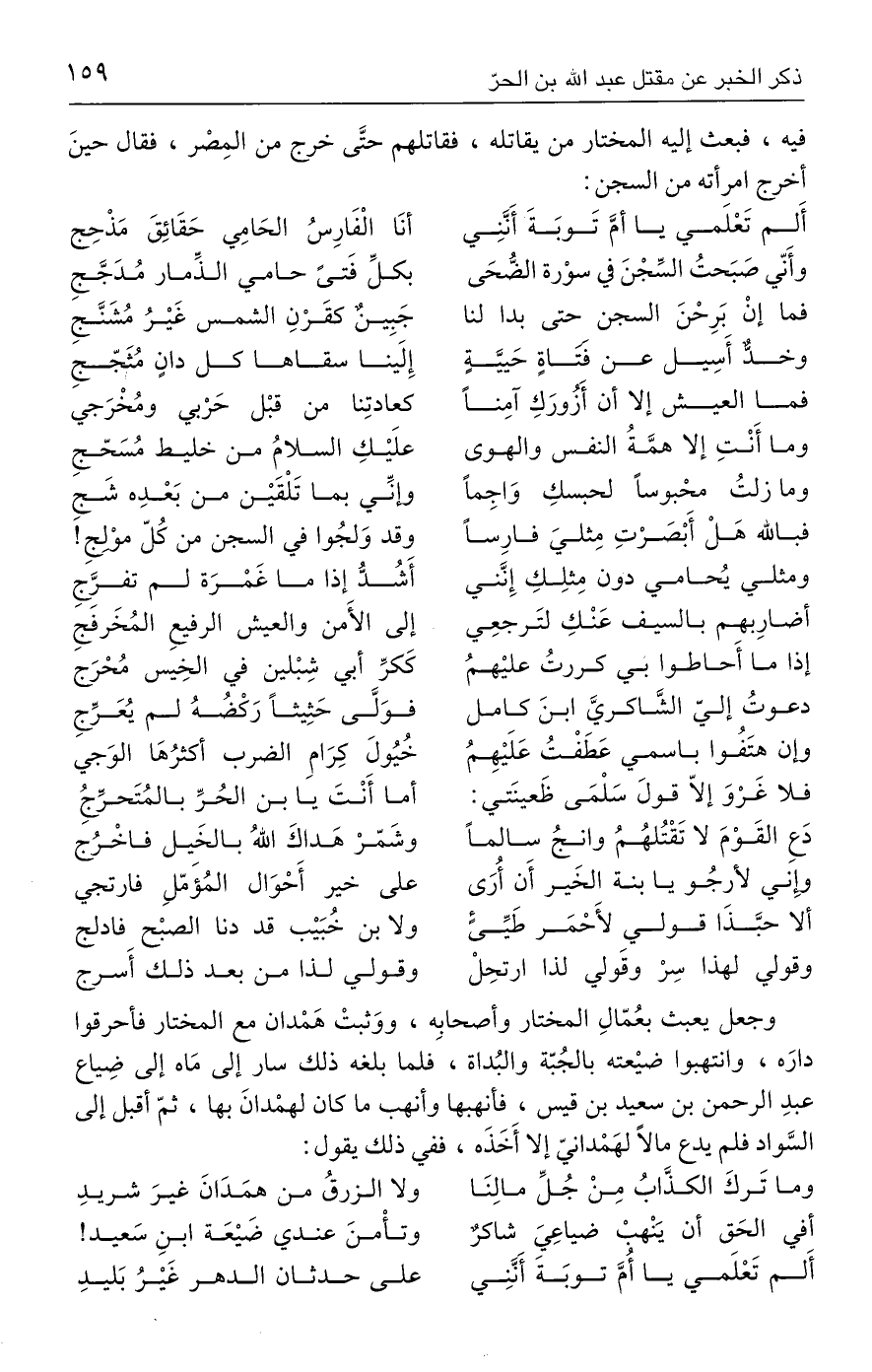 أَلم تَعْلَمي يا أمَّ تَوبَةَ أَنَّنِي ... أنَا الْفَارِسُ الحَامِي حَقَائِقَ مَذْحِج