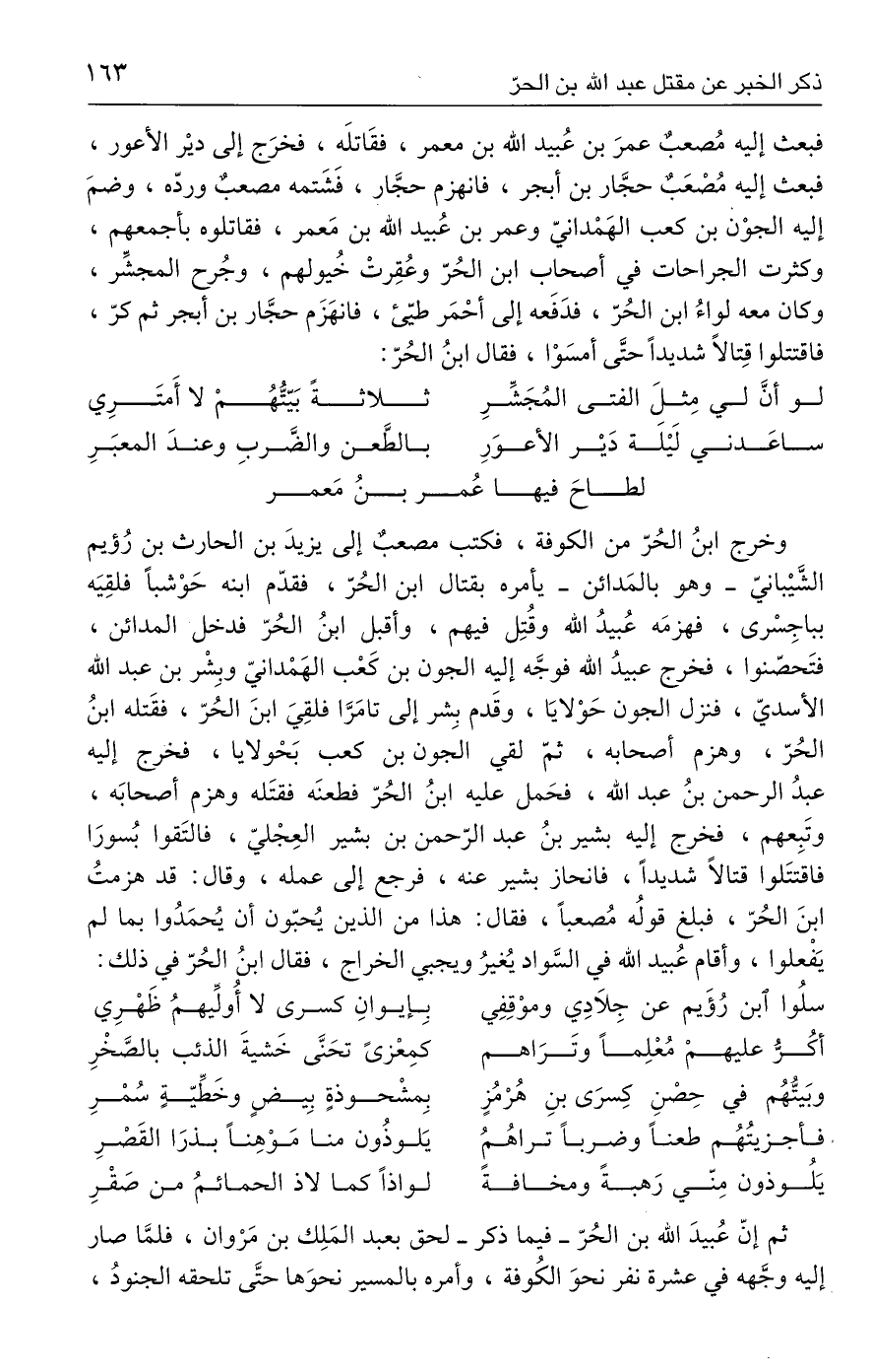 فبعث إليه مُصعبٌ عمرَ بن عُبيد الله بن معمر، فقَاتلَه، فخرَج إلى ديْر الأعور، فبعث إليه مُصْعَبٌ حجَّار بن أبجر، فانهزم حجَّار، فَشَتمه مصعبٌ وردّه، وضمَ إليه الجوْن بن كعب الهَمْدانيّ وعمر بن عُبيد الله بن مَعمر، فقاتلوه بأجمعهم، وكثرت الجراحات في أصحاب ابن الحُرّ وعُقِرتْ خُيولهم، وجُرح المجشِّر، وكان معه لواءُ ابن الحُرّ، فدَفَعه إلى أحْمَر طيّئ، فانهَزَم حجَّار بن أبجر ثم كرّ، فاقتتلوا قِتالًا شديدًا حتَّى أمسَوْا، فقال ابنُ الحُرّ: