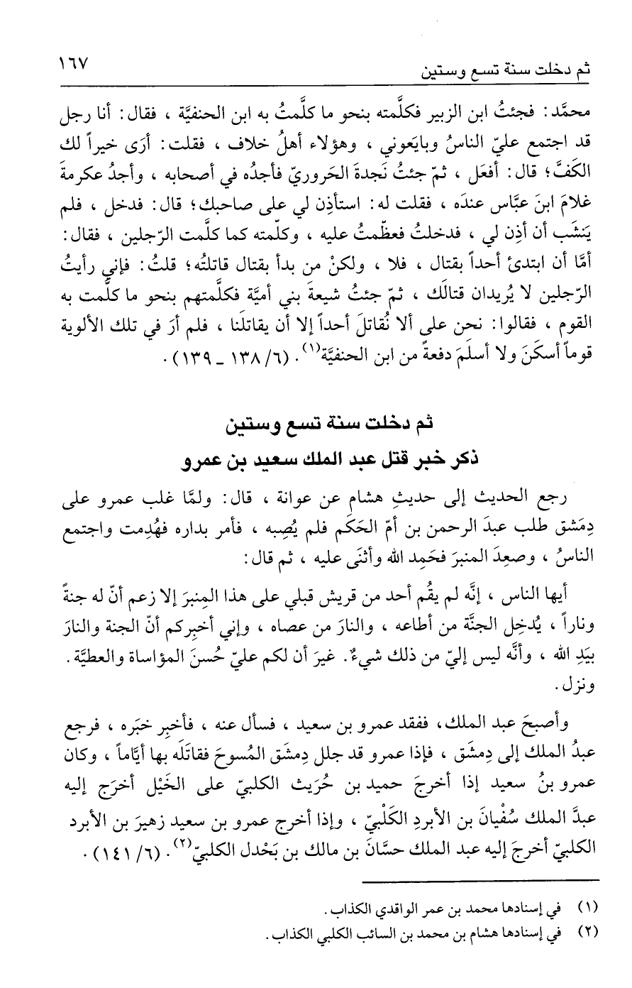 وأصبحَ عبد الملك، ففقد عمرو بن سعيد، فسأل عنه، فأخبِر خبَره، فرجع عبدُ الملك إلى دِمشَق، فإذا عمرو قد جلل دِمشَق المُسوحَ فقاتَلَه بها أيَّامًا، وكان عمرو بنُ سعيد إذا أخرجَ حميد بن حُرَيث الكلبيّ على الخَيْل أخرَج إليه عبدَّ الملك سُفْيانَ بن الأبردِ الكَلْبيّ، وإذا أخرج عمرو بن سعيد زهيرَ بن الأبرد الكلبيّ أخرجَ إليه عبد الملك حسَّانَ بن مالك بن بَحْدل الكلبيّ (٢). (٦/ ١٤١).