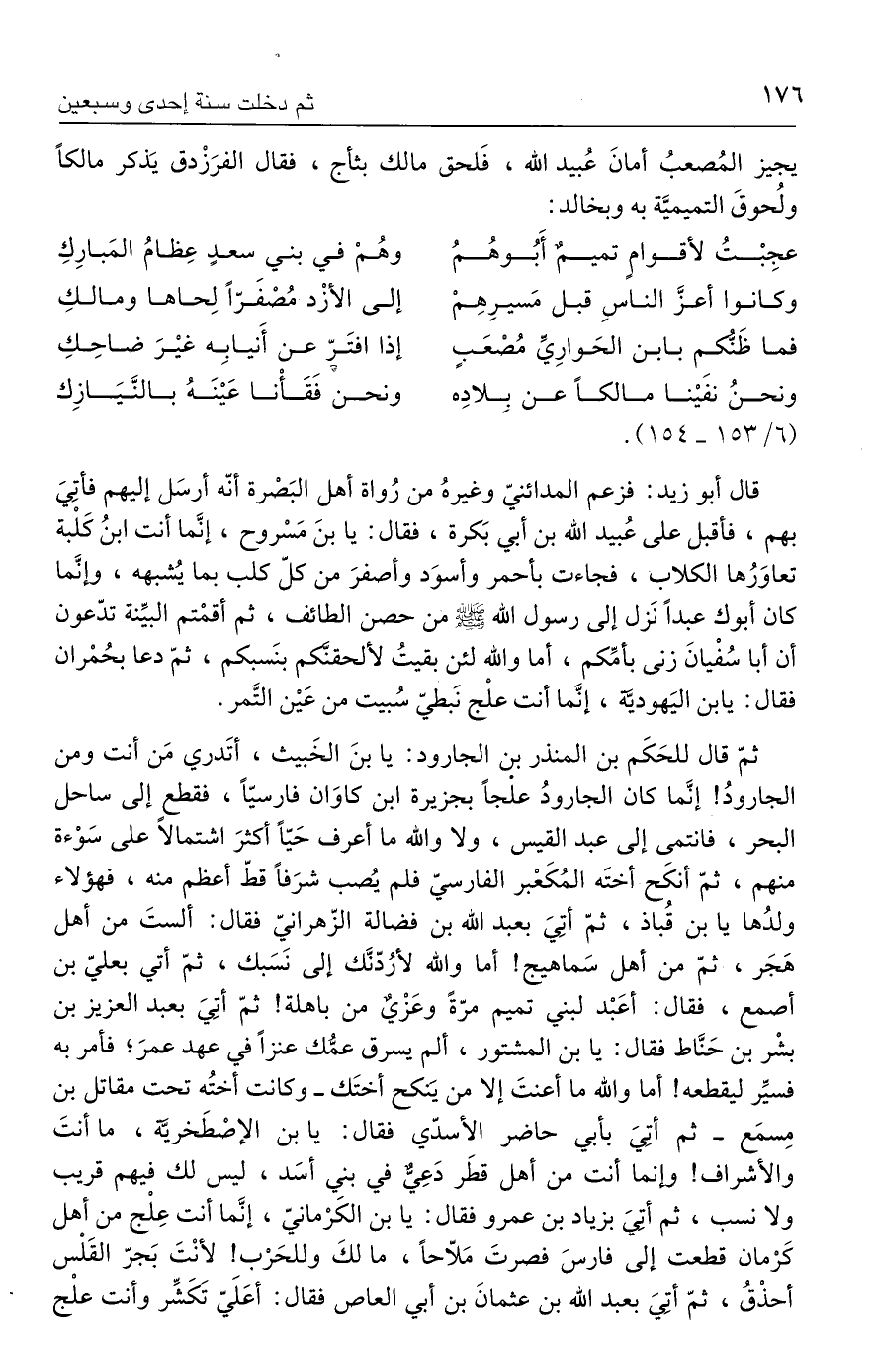 ثمّ قال للحَكَم بن المنذر بن الجارود: يا بنَ الخَبيث، أتَدري مَن أنت ومن الجارودُ! إنَّما كان الجارودُ علْجًا بجزيرة ابن كاوَان فارسيًّا، فقطع إلى ساحل البحر، فانتمى إلى عبد القيس، ولا والله ما أعرف حَيًّا أكثرَ اشتمالًا على سَوْءة منهم، ثمّ أنكَح أختَه المُكَعْبر الفارسيّ فلم يُصب شرَفًا قطّ أعظم منه، فهؤلاء ولدُها يا بن قُباذ، ثمّ أتِيَ بعبد الله بن فضالة الزّهرانيّ فقال: ألستَ من أهل هَجَر، ثمّ من أهل سَماهيج! أما والله لأرُدّنَّك إلى نَسَبك، ثمّ أتي بعليّ بن أصمع، فقال: أعَبْد لبني تميم مرّةً وعَزْيٌ من باهلة! ثمّ أتِيَ بعبد العزيز بن بشْر بن حَنَّاط فقال: يا بن المشتور، ألم يسرق عمُّك عنزًا في عهد عمرَ؛ فأمر به فسيِّر ليقطعه! أما والله ما أعنتَ إلا من يَنكح أختَك - وكانت أختُه تحت مقاتل بن مِسمَع - ثم أتِيَ بأبي حاضر الأسدّي فقال: يا بن الإصْطَخريّة، ما أنتَ والأشراف! وإنما أنت من أهل قطَر دَعِيٌّ في بني أسَد، ليس لك فيهم قريب ولا نسب، ثم أتيَ بزياد بن عمرو فقال: يا بن الكَرْمانيّ، إنَّما أنت عِلْج من أهل كَرْمان قطعت إلى فارسَ فصرتَ مَلّاحًا، ما لكَ وللحَرْب! لأنْتَ بَجرّ القَلْس أحذْقُ، لمّ أتِيَ بعبد الله بن عثمانَ بن أبي العاص فقال: أعَلَيّ تَكَشِّر وأنت علْج