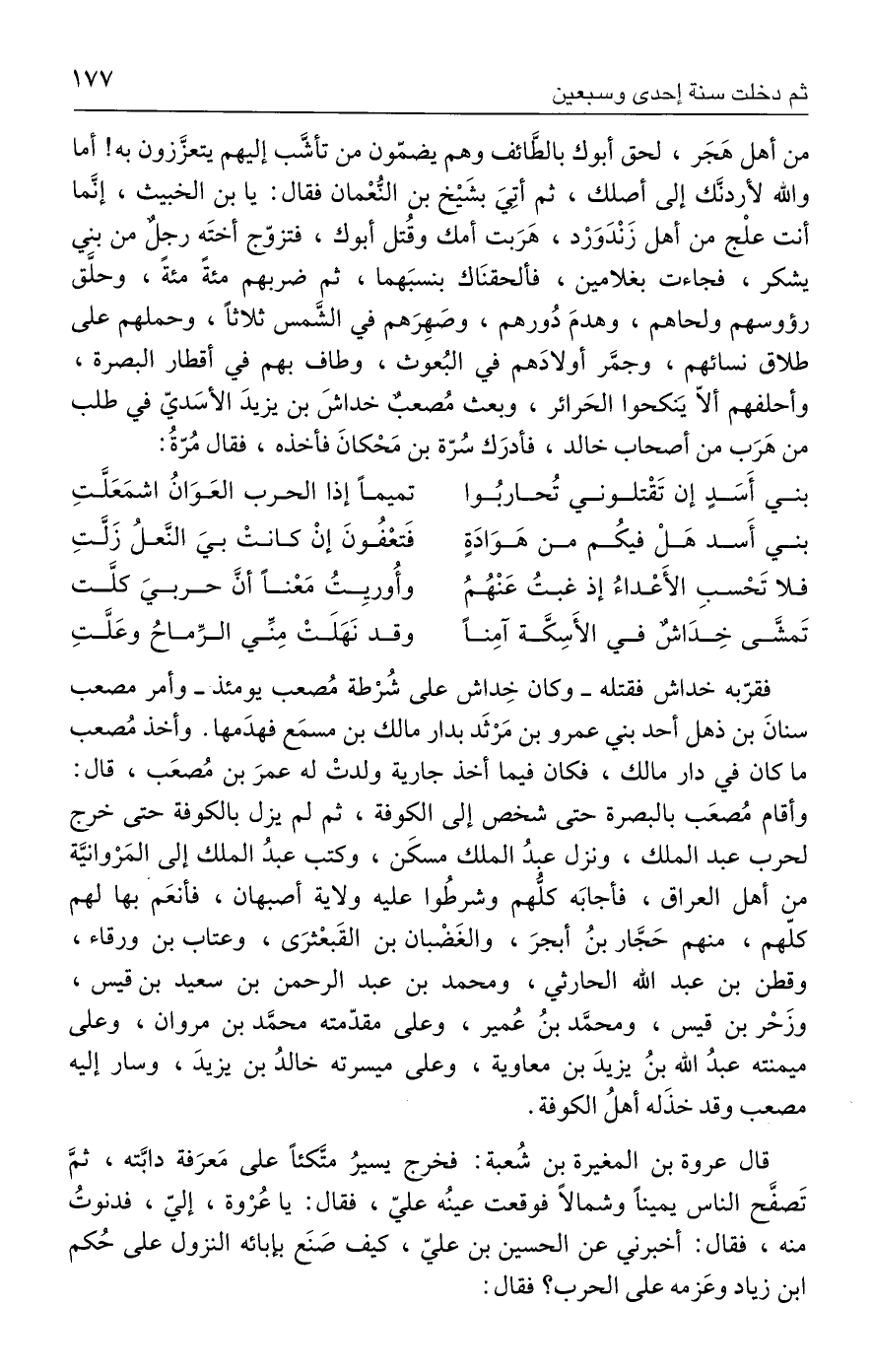 فقرّبه خداش فقتله - وكان خِداش على شُرْطة مُصعب يومئذ - وأمر مصعب سنانَ بن ذهل أحد بني عمرو بن مَرْثَد بدار مالك بن مسمَع فهدَمها. وأخذ مُصعب ما كان في دار مالك، فكان فيما أخذ جارية ولدتْ له عمرَ بن مُصعَب، قال: وأقام مُصعَب بالبصرة حتى شخص إلى الكوفة، ثم لم يزل بالكوفة حتى خرج لحرب عبد الملك، ونزل عبدُ الملك مسكَن، وكتب عبدُ الملك إلى المَرْوانيَّة من أهل العراق، فأجابَه كلُّهم وشرطُوا عليه ولاية أصبهان، فأنعَم بها لهم كلهم، منهم حَجَّار بنُ أبجرَ، والغَضْبان بن القَبعْثرَى، وعتاب بن ورقاء، وقطن بن عبد الله الحارثي، ومحمد بن عبد الرحمن بن سعيد بن قيس، وزَحْر بن قيس، ومحمَّد بنُ عُمير، وعلى مقدّمته محمَّد بن مروان، وعلى ميمنته عبدُ الله بنُ يزيدَ بن معاوية، وعلى ميسرته خالدُ بن يزيدَ، وسار إليه مصعب وقد خذَله أهلُ الكوفة.
