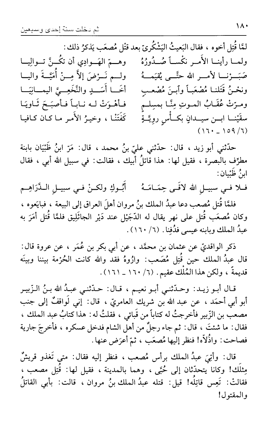 ذكر الواقديّ عن عثمان بن محمَّد، عن أبي بكر بن عُمَر، عن عروة قال: قال عبدُ الملك حين قُتِل مُصَعب: وارُوهُ فقد والله كانت الحُرْمة بيننا وبينَه قديمةً، ولكن هذا المُلْك عقيم. (٦/ ١٦٠ - ١٦١).