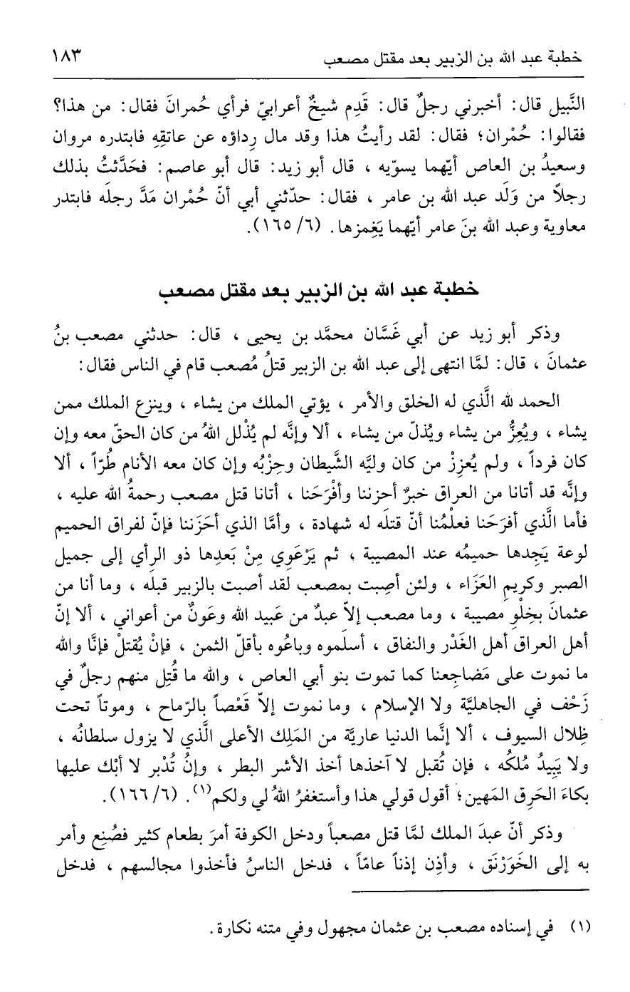 وذكر أبو زيد عن أبي غَسَّان محمَّد بن يحيى، قال: حدثني مصعب بنُ عثمانَ، قال: لمَّا انتهى إلى عبد الله بن الزبير قتلُ مُصعب قام في الناس فقال: الحمد لله الَّذي له الخلق والأمر، يؤتي الملك من يشاء، وينزع الملك ممن يشاء، ويُعِزُّ من يشاء ويُذلّ من يشاء، ألا وإنَّه لم يُذْلل اللهُ من كان الحقّ معه وإن كان فردًا، ولم يُعزِزْ من كان وليَّه الشَّيطان وحِزْبُه وإن كان معه الأنام طُرًّا، ألا وإنَّه قد أتانا من العراق خبرٌ أحزننا وأفْرَحَنا، أتانا قتل مصعب رحمةُ الله عليه، فأما الَّذي أفرَحَنا فعلمُنا أنّ قتلَه له شهادة، وأمَّا الذي أحَزَننا فإنّ لفراق الحميم لوعة يَجِدها حميمُه عند المصيبة، ثم يَرْعَوِي مِنْ بَعدِها ذو الرِأي إلى جميل الصبر وكريمِ العَزَاء، ولئن أصِبت بمصعب لقد أصبت بالزبير قبله، وما أنا من عثمانَ بخِلْوِ مصيبة، وما مصعب إلّا عبدٌ من عَبيد الله وعَونٌ من أعواني، ألا إنّ أهل العراق أهل الغَدْر والنفاق، أسلَموه وباعُوه بأقلّ الثمن، فإنْ يُقتلْ فإنَّا والله ما نموت على مَضاجِعنا كما تموت بنو أبي العاص، والله ما قُتِل منهم رجلٌ في زَحْف في الجاهليَّة ولا الإسلام، وما نموت إلّا قَعْصًا بالرّماح، وموتًا تحت ظِلال السيوف، ألا إنَّما الدنيا عاريَّة من المَلِك الأعلى الَّذي لا يزول سلطانُه، ولا يَبِيدُ مُلكُه، فإن تُقبل لا آخذها أخذ الأشر البطر، وإن تُدْبر لا أبْك عليها بكاءَ الحَرِق المَهين؛ أقول قولي هذا وأستغفرُ اللهُ لي ولكم (١) (٦/ ١٦٦).