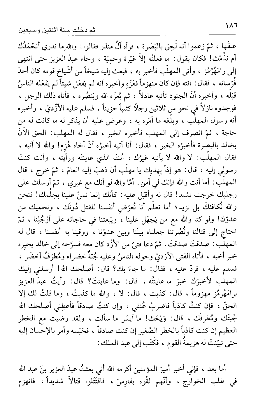 أما بعد، فإني أخبر أميرَ المؤمنين أكرمه الله أني بعثتُ عبدَ العزيز بنَ عبد الله في طلب الخوارج، وأنّهم لقُوه بفارِسَ، فاقتَتَلوا قتالًا شديدًا، فانهزم