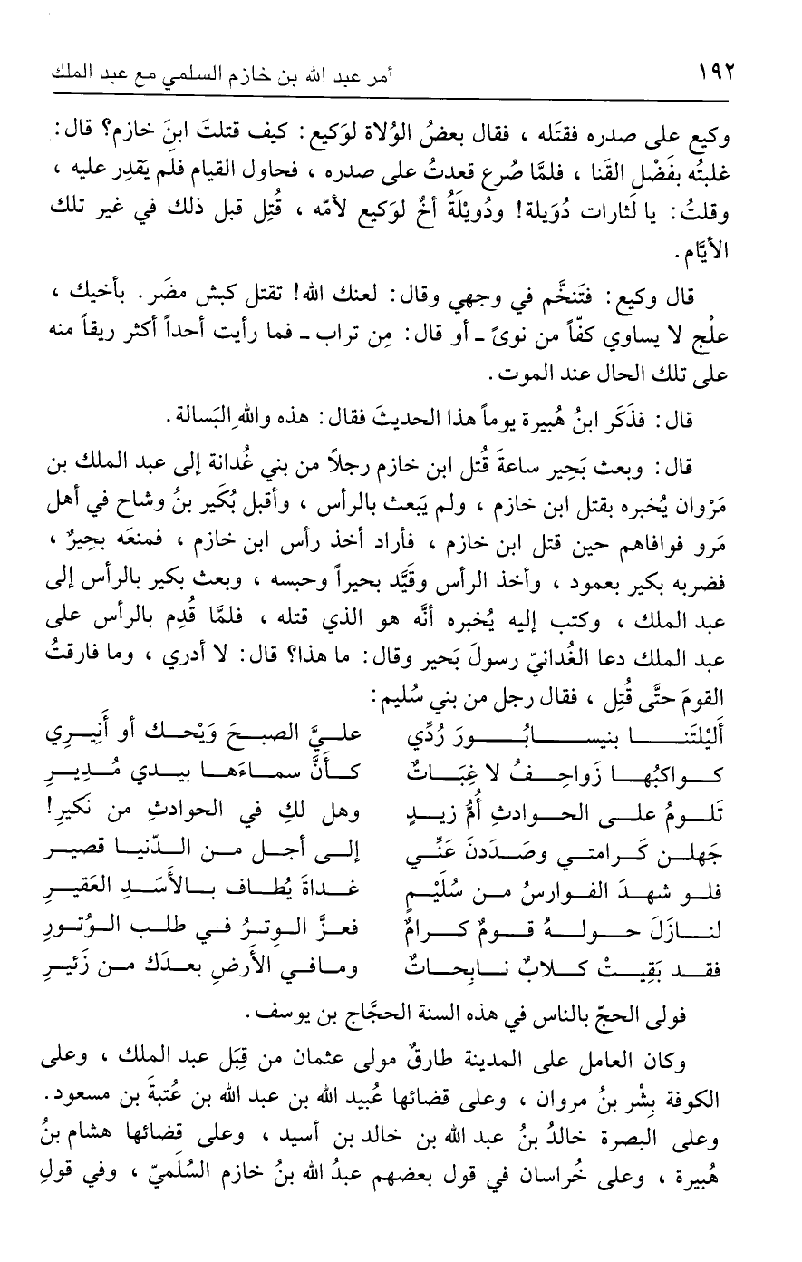 وكيع على صدره فقتَله، فقال بعضُ الوُلاة لوَكيع: كيف قتلتَ ابنِ خازم؟ قال: غلبتُه بفَضْل القَنا، فلمَّا صُرع قعدتُ على صدره، فحاول القيام فلم تقدِر عليه، وقلتُ: يا لَثارات دُوَيلة! ودُويْلَةُ أخ لوَكيع لأمّه، قُتِل قبل ذلك في غير تلك الأيَّام.