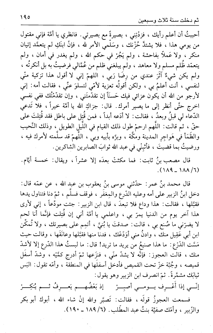 فسمعت العجوزُ قولَه، فقالت: تَصبَّر والله إنْ شاء الله، أبوك أبو بكر والزّبير، وأمّك صفيَّة بنتُ عبد المطّلب. (٦/ ١٨٩ - ١٩٠).