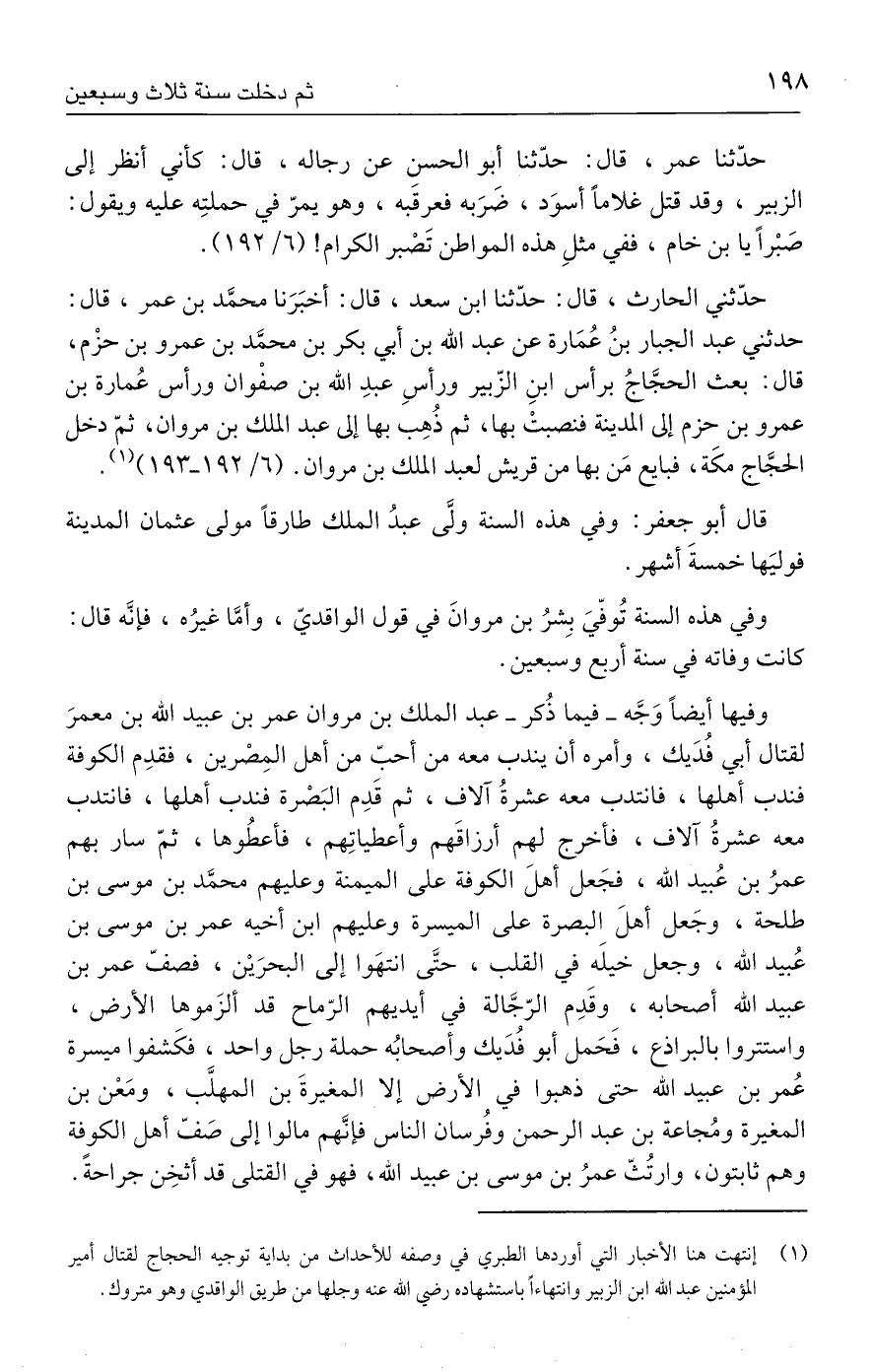 (١) انتهت هنا الأخبار التي أوردها الطبري في وصفه للأحداث من بداية توجيه الحجاج لقتال أمير المؤمنين عبد الله ابن الزبير وانتهاءًا باستشهاده رضي الله عنه وجلها من طريق الواقدي وهو متروك.