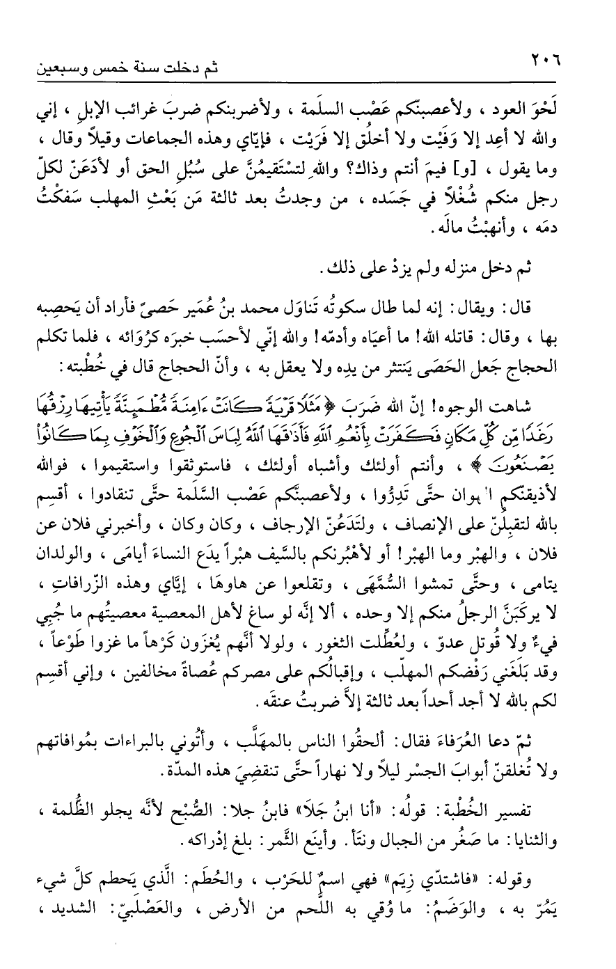 لَحْوَ العود، ولأعصبنكم عَصْب السلَمة، ولأضربنكم ضربَ غرائب الإبلِ، إني والله لا أعِد إلا وَفَيْت ولا أخلُق إلا فَرَيْت، فإيّاي وهذه الجماعات وقيلًا وقال، وما يقول، أو، فيمَ أنتم وذاك؛ واللهِ لتسْتَقيمُنَّ على سُبُلِ الحق أو لأدَعَنّ لكلّ رجل منكم شُغْلًا في جَسَده، من وجدتُ بعد ثالثة مَن بَعْثِ المهلب سَفكْتُ دمَه، وأنهبْتُ مالَه.