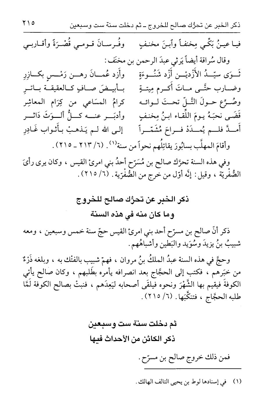 وفي هذه السنة تحرَّك صالح بن مُسَرّح أحدُ بني امرئ القيس، وكان يرى رأىَ الصُّفْريّة، وقيل: إنَّه أوّل من خرج من الصُّفْرّية. (٦/ ٢١٥).