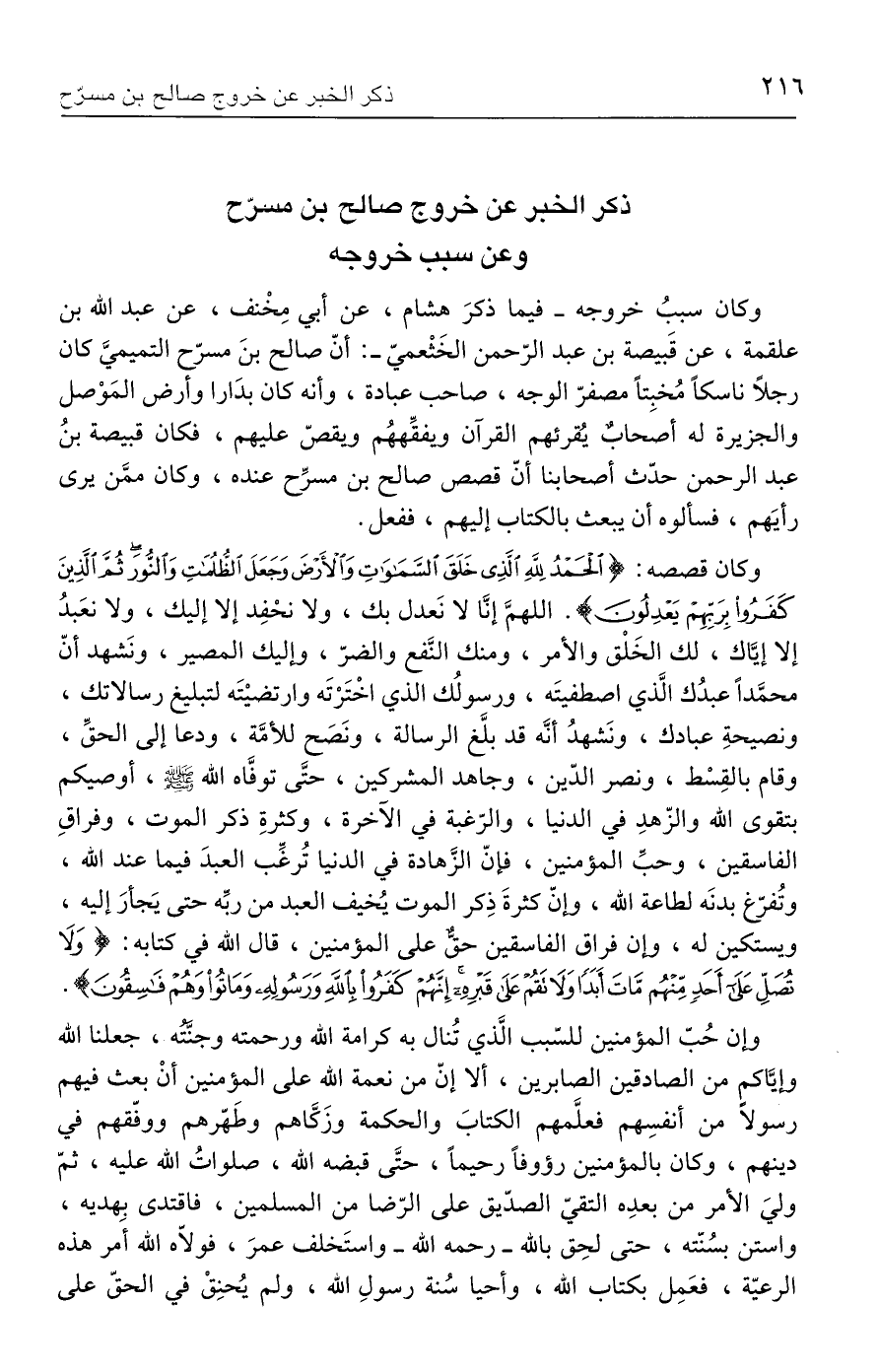وكان سببُ خروجه - فيما ذكرَ هشام، عن أبي مِخْنف، عن عبد الله بن علقمة، عن قَبيصة بن عبد الرّحمن الخَثْعميّ -: أنّ صالح بنَ مسرّح التميميَّ كان رجلًا ناسكًا مُخبِتًا مصفرّ الوجه، صاحب عبادة، وأنه كان بدَارا وأرض المَوْصل والجزيرة له أصحابٌ يُقرئهم القرآن ويفقِّههُم ويقصّ عليهم، فكان قبيصة بنُ عبد الرحمن حدّث أصحابنا أنّ قصص صالح بن مسرِّح عنده، وكان ممَّن يرى رأيَهم، فسألوه أن يبعث بالكتاب إليهم، ففعل.