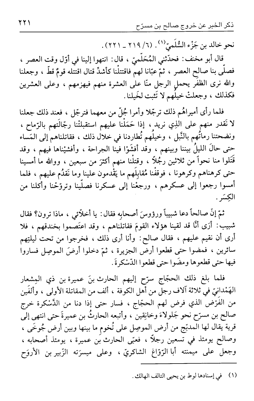 قال أبو مخنف: فحدّثني المُحَلّميّ، قال: انتهوا إلينا في أوّل وقت العصر، فصلّى بنا صالح العصر، ثمّ عبّانا لهم فاقتتلْنا كأشدِّ قتال اقتتله قومٌ قطّ، وجعلنا والله نرى الظفر يحمل الرجل منّا على العشرة منهم فيهزمهم، وعلى العشرين فكذلك، وجعلتْ خيلهم لا تَثبت لخَيلنا.