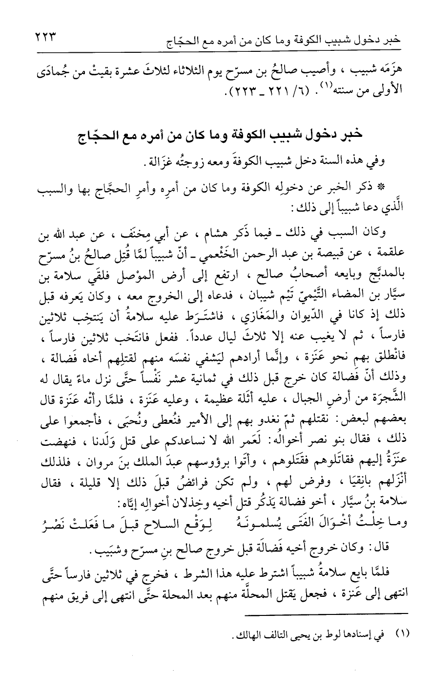 هزَمَه شبيب، وأصيب صالحُ بن مسرّح يوم الثلاثاء لثلاثَ عشرة بقيتْ من جُمادَى الأولى من سنته (١). (٦/ ٢٢١ - ٢٢٣).