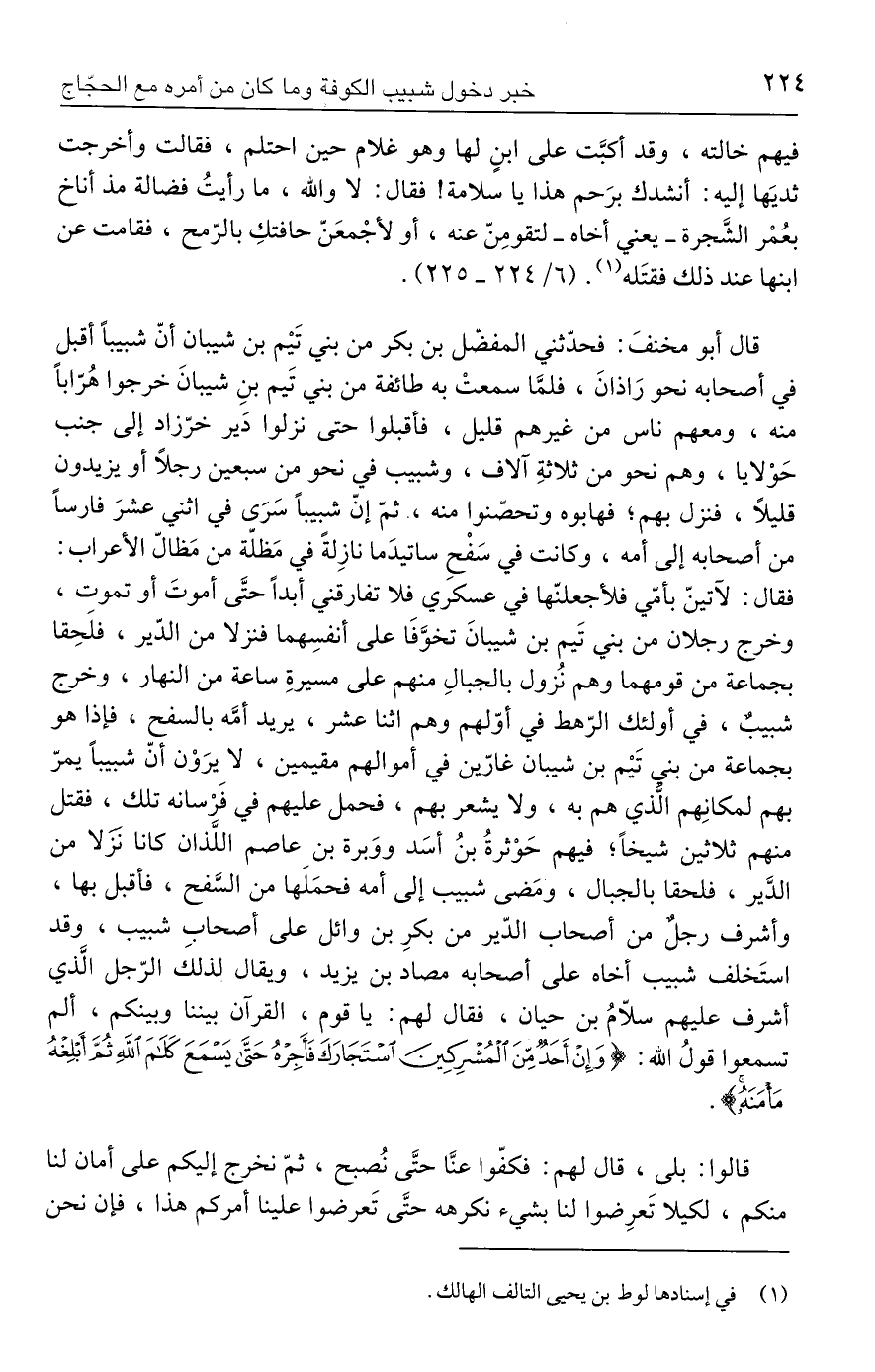 قال أبو مخنفَ: فحدّثني المفضّل بن بكر من بني تَيْم بن شيبان أنّ شبيبًا أقبل في أصحابه نحو رَاذانَ، فلمَّا سمعتْ به طائفة من بني تَيم بنِ شيبانَ خرجوا هُرّابًا منه، ومعهم ناس من غيرهم قليل، فأقبلوا حتى نزلوا دَير خرّزاد إلى جنب حَوْلايا، وهم نحو من ثلاثةِ آلاف، وشبيب في نحو من سبعين رجلًا أَو يزيدون قليلًا، فنزل بهم؛ فهابوه وتحصّنوا منه، . ثمّ إنّ شبيبًا سَرَى في اثني عشرَ فارسًا من أصحابه إلى أمه، وكانت في سَفْحِ ساتيدَما نازِلةً فَي مَظلّة من مَظالّ الأعراب: فقال: لآتينّ بأمّي فلأجعلنّها في عسكري فلا تفارقني أبدًا حتَّى أموتَ أو تموت، وخرج رجلان من بني تَيم بن شيبانَ تخوَّفَا على أنفسِهما فنزلا من الدّير، فلَحِقا بجماعة من قومهما وهم نُزول بالجبالِ منهم على مسيرةِ ساعة من النهار، وخرج شبيبٌ، في أولئك الرّهط في أوّلهم وهم اثنا عشر، يريد أمَّه بالسفح، فإذا هو بجماعة من بني تَيْم بن شيبان غارّين في أموالهم مقيمين، لا يرَوْن أنّ شبيبَّا يَمرّ بهم لمكانِهم الّذي هم به، ولا يشعر بهم، فحمل عليهم في فَرسانه تلك، فقتل منهم ثلاثين شيخًا؛ فيهم حَوْثرةُ بنُ أسَد ووَبرة بن عاصم اللّذان كانا نزَلا من الدَّير، فلحقا بالجبال، ومَضى شبيب إلى أمه فحمَلَها من السَّفح، فأقبل بها، وأشرف رجلٌ من أصحاب الدّير من بكرِ بن وائل على أصحاب شبيب، وقد استَخلف شبيب أخاه على أصحابه مصاد بن يزيد، ويقال لذلكَ الرّجل الَّذي أشرف عليهم سلّامُ بن حيان، فقال لهم: يا قوم، القرآن بيننا وبينكم، ألم تسمعوا قولُ الله: {وَإِنْ أَحَدٌ مِنَ الْمُشْرِكِينَ اسْتَجَارَكَ فَأَجِرْهُ حَتَّى يَسْمَعَ كَلَامَ اللَّهِ ثُمَّ أَبْلِغْهُ مَأْمَنَهُ}.