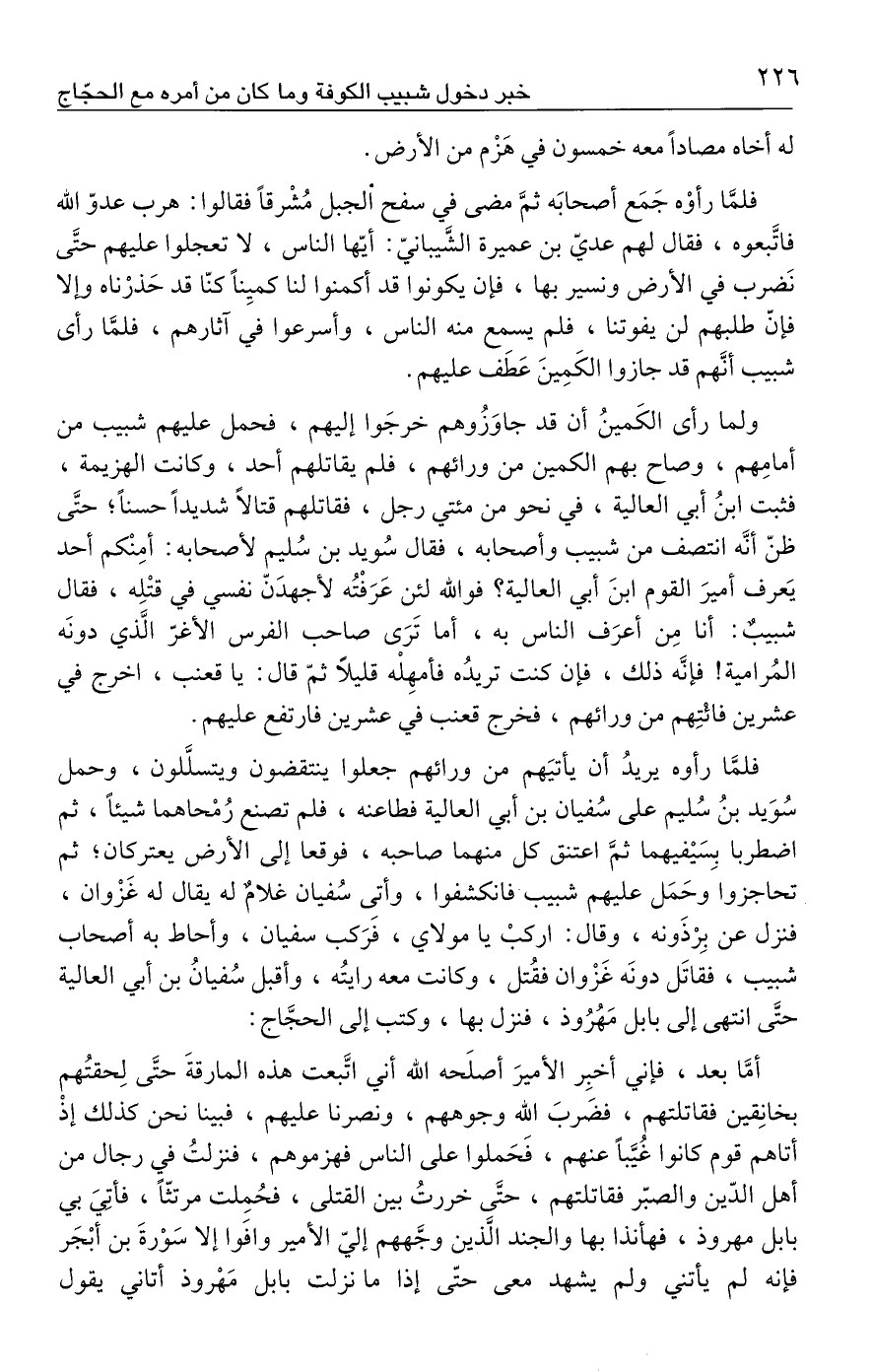 أمَّا بعد، فإني أخبِر الأميرَ أصلَحه الله أني اتَّبعت هذه المارقةَ حتَّى لِحقتُهم بخانِقين فقاتلتهم، فضَربَ الله وجوههم، ونصرنا عليهم، فبينا نحن كذلك إذْ أتاهم قوم كانوا غُيَّبًا عنهم، فَحَملوا على الناس فهزموهم، فنزلتُ في رجال من أهل الدّين والصبر فقاتلتهم، حتَى خررتُ بين القتلى، فحُمِلت مرتثًّا، فأتيَ بي بابل مهروذ، فهأنذا بها والجند الَّذين وجَّههم إليّ الأمير وافَوا إلا سَوْرةَ بن أبْجَر فإنه لم يأتني ولم يشهد معى حتّى إذا ما نزلت بابل مَهْروذ أتاني يقول