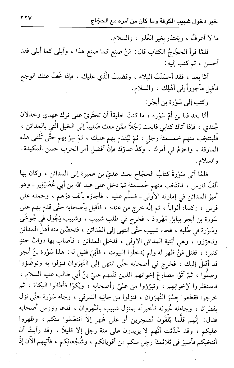 أمَّا بعد فيا بن أمّ سَوْرة، ما كنتَ خليقًا أن تجتَرئ على ترك عهدي وخذلان جُندي، فإذا أتاك كتابي فابعث رَجُلًا ممَّن معك صَليبًا إلى الخيل الَّتي بالمدائن، فَلينتخِب منهم خمسمئة رجلٍ، ثمّ ليُقدم بهم عليك، ثمّ سِرْ بهم حتَّى تَلَقى هذه المارقة، واحزمْ في أمرك، وكدْ عدوّك فإنْ أفضل أمر الحرب حسن المكيدة. والسلام.