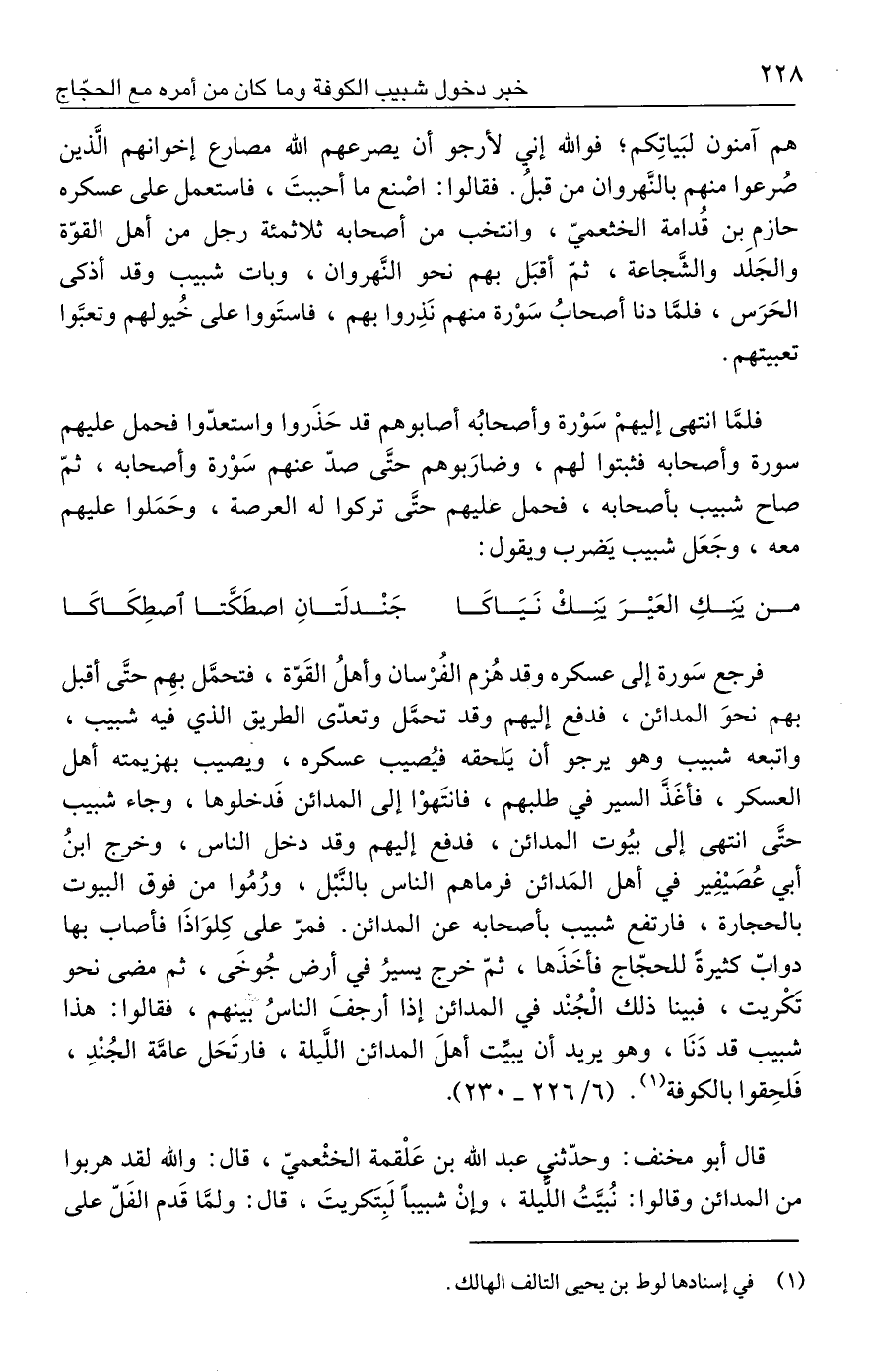 فرجع سَورة إلى عسكره وقد هُزم الفُرْسان وأهلُ القَوّة، فتحمَّل بهِم حتَّى أقبل بهم نحوَ المدائن، فدفع إليهم وقد تحمَّل وتعدَّى الطريق الذي فيه شبيب، واتبعه شبيب وهو يرجو أن يَلحقه فيُصيب عسكره، ويصيب بهزيمته أهل العسكر، فأغَذَّ السير في طلبهم، فانتَهوْا إلى المدائن فَدخلوها، وجاء شبيب حتَّى انتهى إلى بيُوت المدائن، فدفع إليهم وقد دخل الناس، وخرج ابنُ أبي عُصَيْفِير في أهل المَدائن فرماهم الناس بالنَّبْل، ورُمُوا من فوق البيوت بالحجارة، فارتفع شبيب بأصحابه عن المدائن. فمرّ على كِلوَاذَا فأصاب بها دوابّ كثيرةً للحجّاج فأخَذَها، ثمّ خرج يسيرُ في أرض جُوخَى، ثم مضى نحو تَكْريت، فبينا ذلك الْجُنْد في المدائن إذا أرجفَ الناسُ بينهم، فقالوا: هذا شبيب قد دَنَا، وهو يريد أن يبيِّت أهلَ المدائن اللَّيلة، فارتَحَل عامَّة الجُنْدِ، فَلحِقوا بالكوفة (١). (٦/ ٢٢٦ - ٢٣٠).