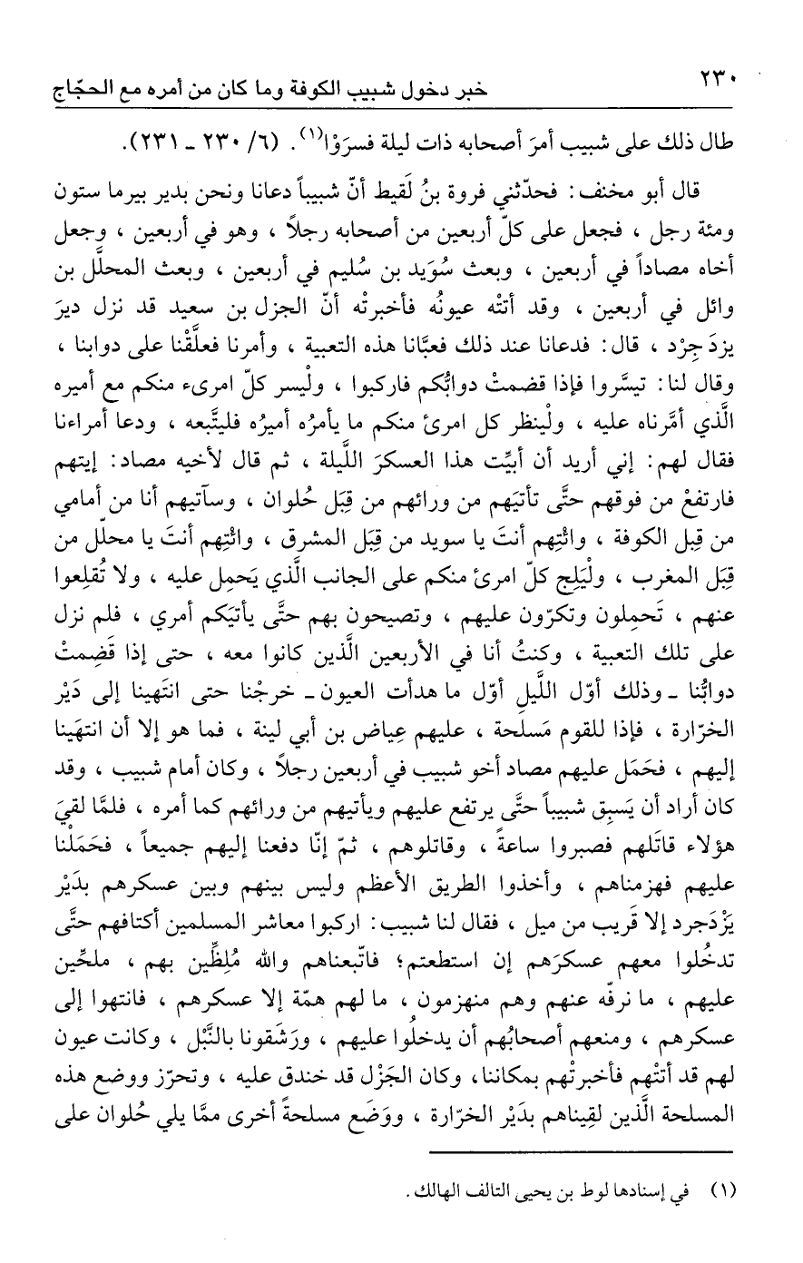 طال ذلك على شبيب أمرَ أصحابه ذات ليلة فسرَوْا (١). (٦/ ٢٣٠ - ٢٣١).