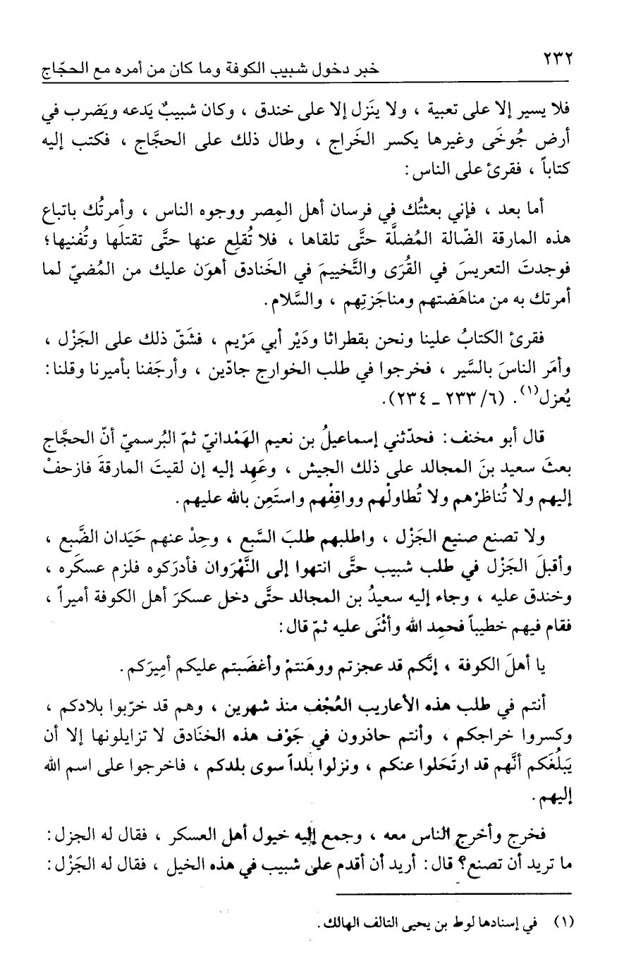 ولا تصنع صنيع الجَزْل، واطلبهم طلبَ السَّبع، وحِدْ عنهم حَيَدان الضَّبع، وأقبلَ الجَزل في طلب شبيب حتَّى انتهوا إلى النَّهْرَوان فأدرَكوه فلزم عسكَره، وخندق عليه، وجاء إليه سعيدُ بن المجالد حتَّى دخل عسكرَ أهل الكوفة أميرًا، فقام فيهم خطيبًا فحمِد الله وأثْنَى عليه ثمّ قال: