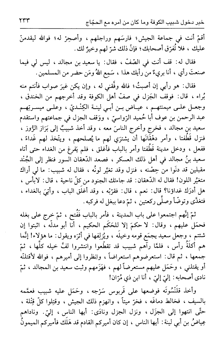 ثمّ إنَّهم اجتمعوا على باب المدينة، فأمر بالباب فَفُتح، ثمّ خرج على بغله فحمَل عليهم، وقال: لا حكمَ إلا للحَكَم الحكيم، أنا أبو مدلّه، اثبتوا إن شئتم، وجعل سعيد يجمَع قومه وخيلَه، ويولفها في أثرَه ويقول: ما هؤلاء! إنَّما هم أكلَةُ رأس، فلمَّا رآهم شبيب قد تقطعوا وانتشروا لفَّ خيله كلَّها، ثمّ جمعها، ثم قال: استعرضوهم استعراضًا، وانظروا إلى أميرهم، فوالله لأقتلنّه أو يقتلني، وحَمَل عليهم مستعرضًا لهم، فهَزَمهم وثبت سعيد بن المجالد، ثمّ نادى أصحابه: إليّ إليّ، أنا ابن ذي مُرّان!