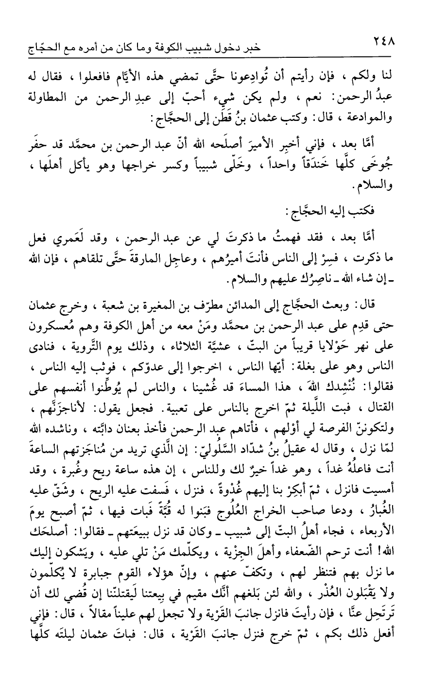 لنا ولكم، فإن رأيتم أن تُوادِعونا حتَّى تمضي هذه الأيَّام فافعلوا، فقال له عبدُ الرحمن: نعم، ولم يكن شيء أحبّ إلى عبدِ الرحمن من المطاولة والموادعة، قال: وكتب عثمان بنُ قَطَن إلى الحجَّاج: