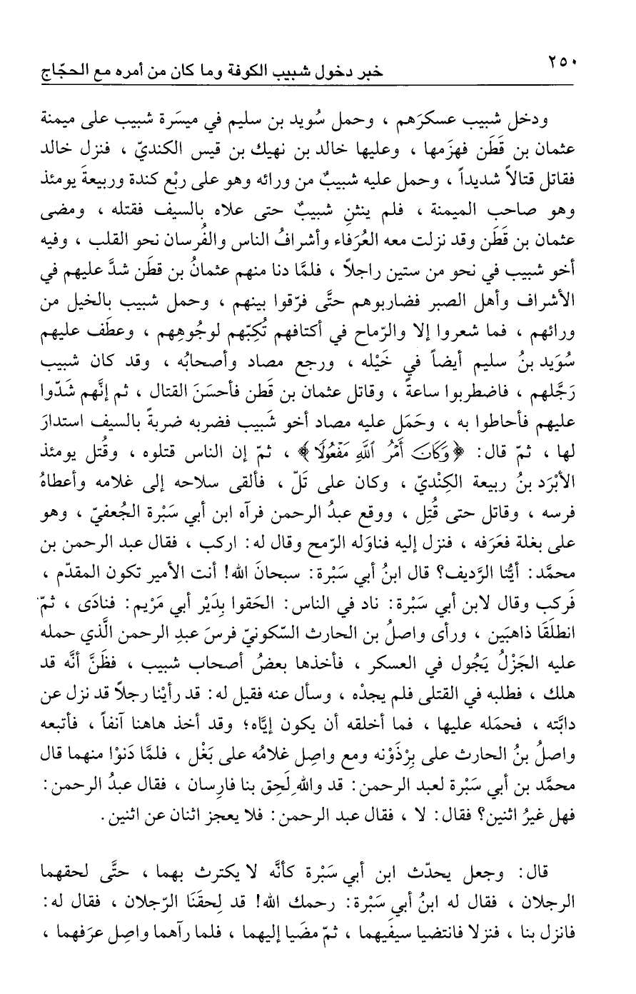 ودخل شبيب عسكرَهم، وحمل سُويد بن سليم في ميسَرة شبيب على ميمنة عثمان بن قَطَن فهزَمها، وعليها خالد بن نهيك بن قيس الكنديّ، فنزل خالد فقاتل قتالًا شديدًا، وحمل عليه شبيبٌ من ورائه وهو على ربْع كندة وربيعةَ يومئذ وهو صاحب الميمنة، فلم ينثنِ شبيبٌ حتى علاه بالسيف فقتله، ومضى عثمان بن قَطَن وقد نزلت معه العُرَفاء وأشرافُ الناس والفُرسان نحو القلب، وفيه أخو شبيب في نحو من ستين راجلًا، فلمَّا دنا منهم عثمانُ بن قطَن شدَّ عليهم في الأشراف وأهل الصبر فضاربوهم حتَّى فرّقوا بينهم، وحمل شبيب بالخيل من ورائهم، فما شعروا إلا والرّماح في أكتافهم تُكِبّهم لوجُوهِهم، وعطَف عليهم سُوَيد بنُ سليم أيضًا في خَيْله، ورجع مصاد وأصحابُه، وقد كان شبيب رَجَّلهم، فاضطربوا ساعة، وقاتل عثمان بن قَطن فأحسَنَ القتال، ثم إنَّهم شَدّوا عليهم فأحاطوا به، وحَمَل عليه مصاد أخو شَبيب فضربه ضربةً بالسيف استدارَ لها، ثمّ قال: {وَكَانَ أَمْرُ اللَّهِ مَفْعُولًا}، ثمّ إن الناس قتلوه، وقُتل يومئذ الأبْرَد بنُ ربيعة الكِنْديّ، وكان على تَلّ، فألقى سلاحه إلى غلامه وأعطاهُ فرسه، وقاتل حتى قُتِل، ووقع عبدُ الرحمن فرآه ابن أبي سَبْرة الجُعفيّ، وهو على بغلة فعَرَفه، فنزل إليه فناوَله الرّمح وقال له: اركب، فقال عبد الرحمن بن محمَّد: أيُّنا الرَّديف؟ قال ابنُ أبي سَبْرة: سبحانَ الله! أنت الأمير تكون المقدّم، فَركب وقال لابن أبي سَبْرة: ناد في الناس: الحَقوا بِدَيْر أبي مَرْيم: فنادَى، ثمّ انطلَقَا ذاهبَين، ورأى واصلُ بن الحارث السّكونيّ فرسَ عبدِ الرحمن الَّذي حمله عليه الجَزْلُ يَجُول في العسكر، فأخذها بعضُ أصحاب شبيب، فظَنَّ أنَّه قد هلك، فطلبه في القتلى فلم يجدْه، وسأل عنه فقيل له: قد رأيْنا رجلًا قد نزل عن دابَّته، فحمَله عليها، فما أخلقه أن يكون إيَّاه؛ وقد أخذ هاهنا آنفًا، فأتبعه واصلُ بنُ الحارث على بِرْذَوْنه ومع واصِل غلامُه على بَغْل، فلمَّا دَنوْا منهما قال محمَّد بن أبي سَبْرة لعبد الرحمن: قد واللهِ لَحِق بنا فارِسان، فقال عبدُ الرحمن: فهل غيرُ اثنين؟ فقال: لا، فقال عبد الرحمن: فلا يعجز اثنان عن اثنين.