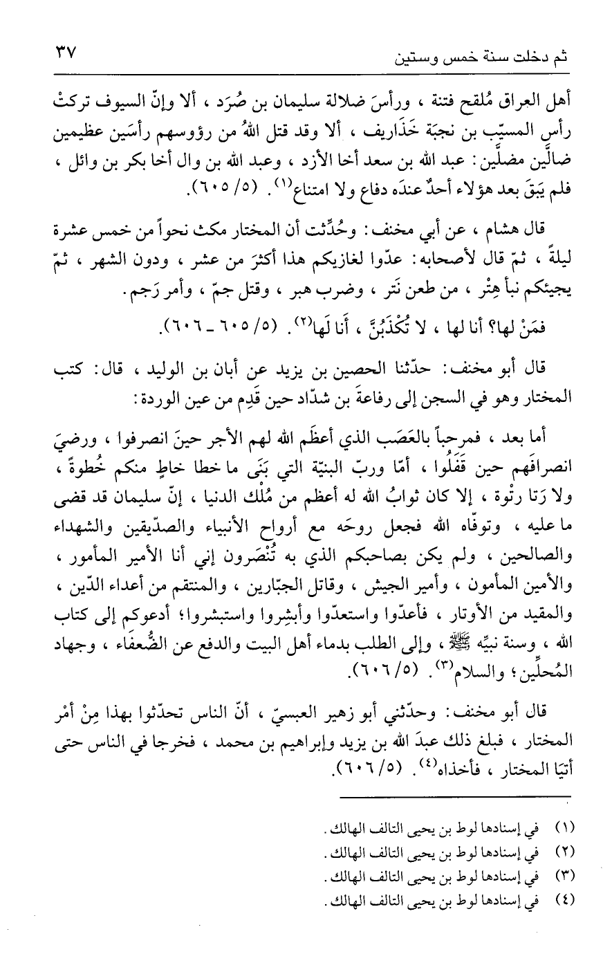 قال أبو مخنف: وحدّثني أبو زهير العبسيّ، أنّ الناس تحدّثوا بهذا مِنْ أمْر المختار، فبلغ ذلك عبدَ الله بن يزيد وإبراهيم بن محمد، فخرجا في الناس حتى أتيَا المختار، فأخذاه (٤). (٥/ ٦٠٦).