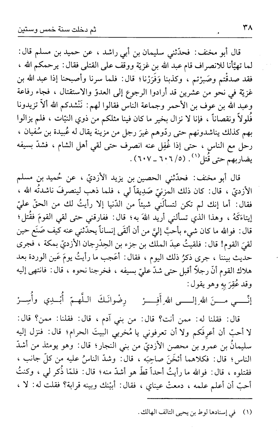 قال أبو مخنف: فحدّثني سليمان بن أبي راشد، عن حميد بن مسلم قال: لما تهيَّأنا للانصراف قام عبد الله بنِ غزيّة ووقف على القتلى فقال: يرحمكم الله، فقد صدقْتم وصَبرْتم، وكذبنا وَفرَرْنا؛ قال: فلما سرنا وأصبحنا إذا عبد الله بن غزيّة في نحو من عشرين قد أرادوا الرجوع إلى العدوّ والاستقتال، فجاء رفاعة وعبد الله بن عوف بن الأحمر وجماعة الناس فقالوا لهم: نَنْشدكم الله ألّا تزيدونا فُلولًا ونقصانًا، فإنا لا نزال بخير ما كان فينا مثلكم من ذوي النيّات، فلم يزالوا بهم كذلك يناشدونهم حتى ردّوهم غيرَ رجل من مزينة يقال له عُبيدة بن سُفيان، رحل مع الناس، حتى إذا غُفِل عنه انصرف حتى لقي أهل الشام، فشدّ بسيفه يضاربهم حتى قُتل (١). (٥/ ٦٠٦ - ٦٠٧).