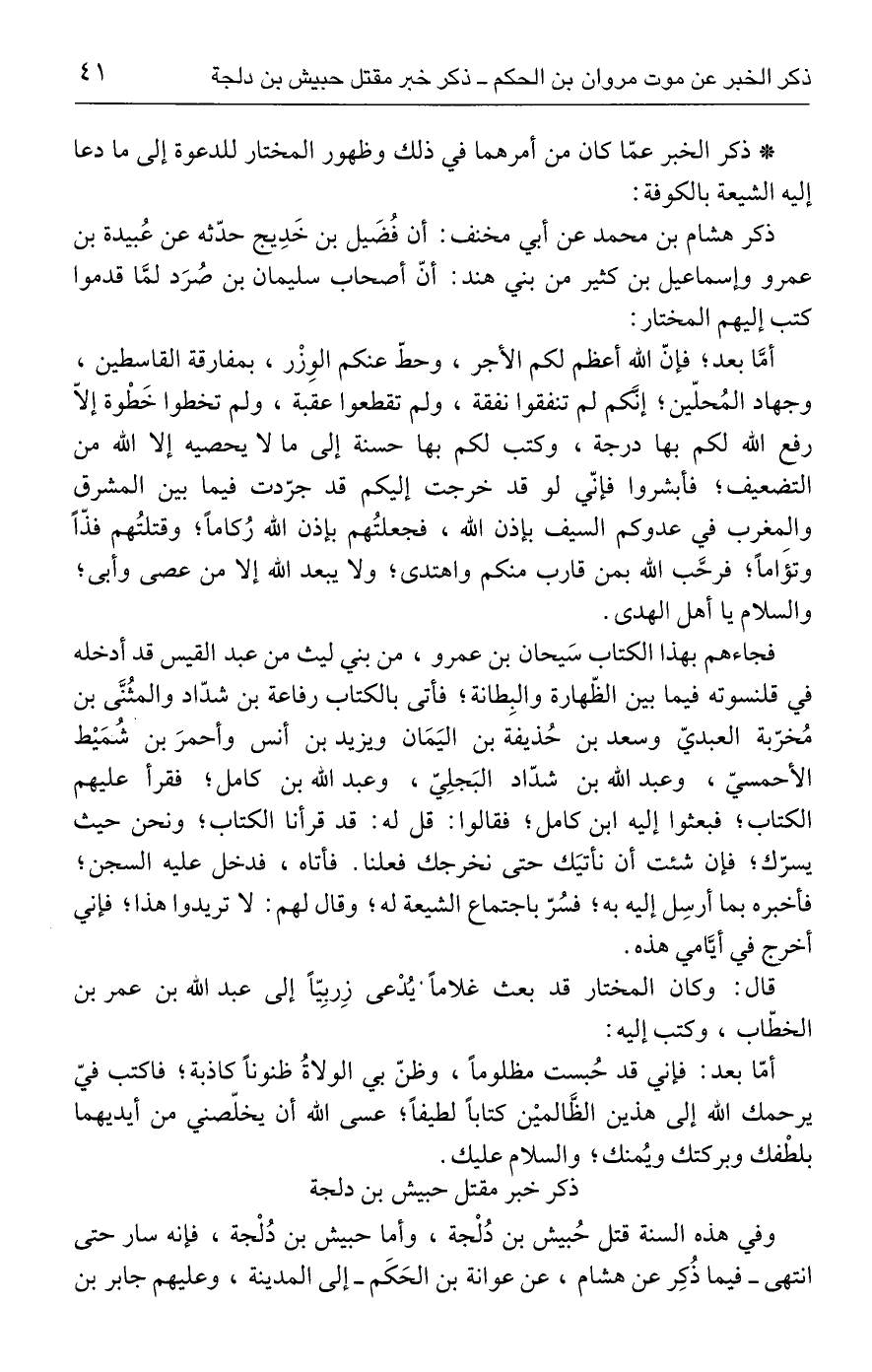 ذكر هشام بن محمد عن أبي مخنف: أن فُضَيل بن خَدِيج حدّثه عن عُبيدة بن عمرو وإسماعيل بن كثير من بنى هند: أنّ أصحاب سليمان بن صُرَد لمَّا قدموا كتب إليهم المختار: