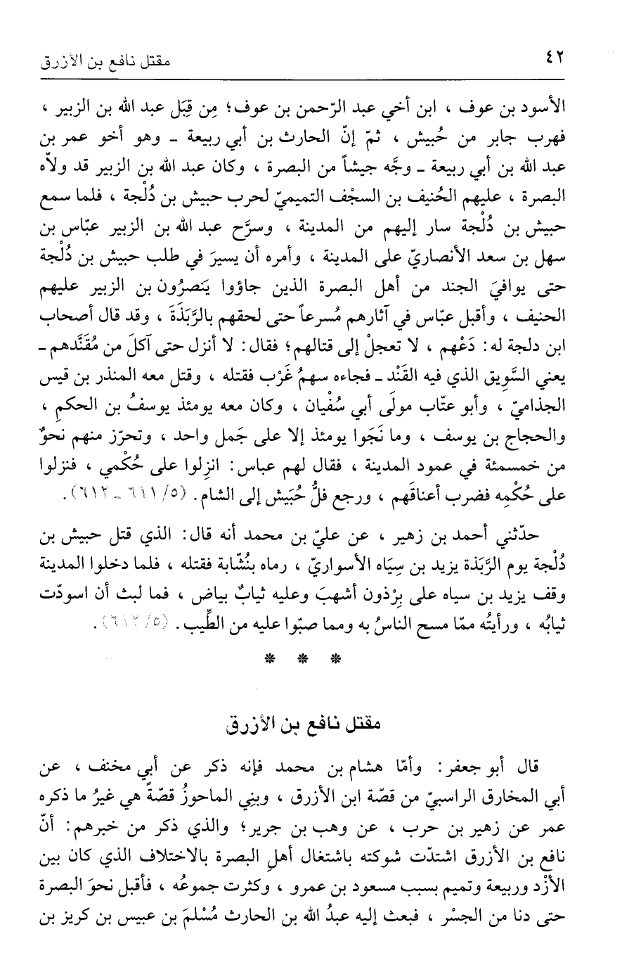 قال أبو جعفر: وأمّا هشام بن محمد فإنه ذكر عن أبي مخنف، عن أبي المخارق الراسبيّ من قصّة ابن الأزرق، وبنِي الماحوزُ قصّةً هي غيرُ ما ذكره عمر عن زهير بن حرب، عن وهب بن جرير؛ والذي ذكر من خبرهم: أنّ نافع بن الأزرق اشتدّت شوكته باشتغال أهلِ البصرة بالاختلاف الذي كان بين الأزْد وربيعة وتميم بسبب مسعود بن عمرو، وكثرت جموعُه، فأقبل نحوَ البصرة حتى دنا من الجسْر، فبعث إليه عبدُ الله بن الحارث مُسْلمَ بن عبيس بن كريز بن