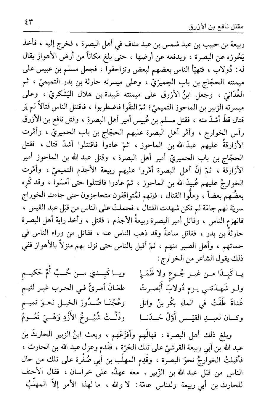 ربيعة بن حبيب بن عبد شمس بن عبد مناف في أهل البصرة، فخرج إليه، فأخذ يَحُوزه عن البصرة، ويدفعه عن أرضها، حتى بلغ مكانًا من أرض الأهواز يقال له: دُولاب، فتهيّأ الناس بعضهم لبعض وتزاحفوا، فجعل مسلم بن عبيس على ميمنته الحجّاج بن باب الحِميرَيّ، وعلى ميسرته حارثة بن بدر التميميّ، ثم الغُدَانيّ، وجعل ابنُ الأزرق على ميمنته عَبيدة بن هلال اليَشْكريّ، وعلى ميسرته الزبير بن الماحوز التميميّ؛ ثمّ التقَوا فاضطربوا، فاقتتل الناس قتالًا لم يَر قتال قطّ أشدّ منه، فقتل مسلم بن عُبيس أمير أهل البصرة، وقتل نافع بن الأزرق رأس الخوارج، وأمَّر أهل البصرة عليهم الحجّاج بن باب الحميريّ، وأمَّرت الأزارقةُ عليهم عبدَ الله بن الماحوز، ثمّ عادوا فاقتتلوا أشدّ قتال، فقتل الحجّاج بن باب الحميريّ أمير أهل البصرة، وقتل عبد الله بن الماحوز أمير الأزارقة، ثمّ إنّ أهل البصرة أمَّروا عليهم ربيعة الأجذم التميميّ، وأمَّرت الخوارجُ عليهم عُبيدَ الله بن الماحوز، ثمّ عادوا فاقتتلوا حتى أمسَوا، وقد كَرِه بعضُهم بعضًا، وملُّوا القتال، فإنهم لمُتواقفون متحاجزون حتى جاءت الخوراج سريّة لهم جامّة لم تكن شهدت القتال، فحملتْ على الناس من قبَل عبد القيس، فانهزم الناس، وقاتل أمير البصرة ربيعةُ الأجذم، فقتل، وأخذ راية أهل البصرة حارثةُ بن بدر، فقاتل ساعةً وقد ذهب الناس عنه، فقاتل من وراء الناس في حماتهم، وأهل الصبر منهم، ثمّ أقبل بالناس حتى نزل بهم منزلًا بالأهواز ففي ذلك يقول الشاعر من الخوارج: