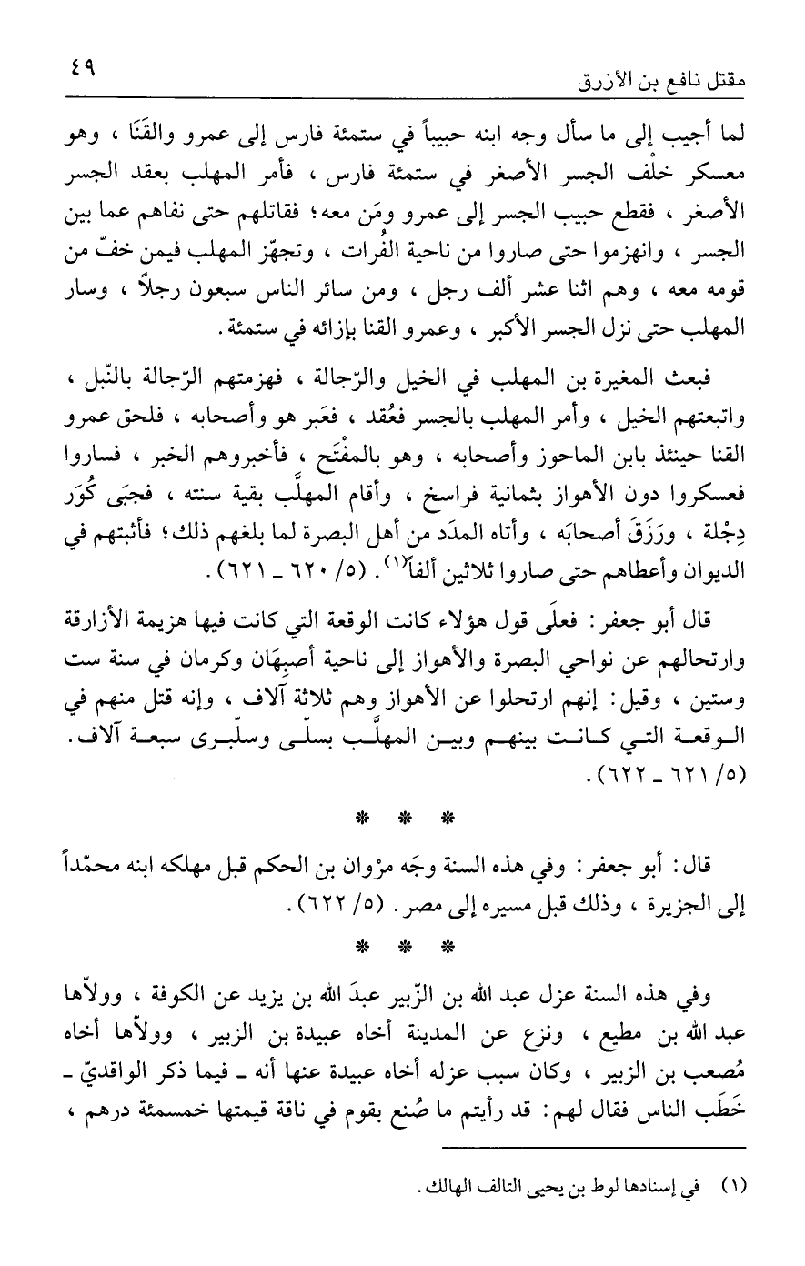 فبعث المغيرة بن المهلب في الخيل والرّجالة، فهزمتهم الرّجالة بالنّبل، واتبعتهم الخيل، وأمر المهلب بالجسر فعُقد، فعَبر هو وأصحابه، فلحق عمرو القنا حينئذ بابن الماحوز وأصحابه، وهو بالمفْتَح، فأخبروهم الخبر، فساروا فعسكروا دون الأهواز بثمانية فراسخ، وأقام المهلَّب بقية سنته، فجبَى كُوَر دِجْلة، ورَزَقَ أصحابَه، وأتاه المدَد من أهل البصرة لما بلغهم ذلك؛ فأثبتهم في الديوان وأعطاهم حتى صاروا ثلاثين ألفًا (١). (٥/ ٦٢٠ - ٦٢١).
