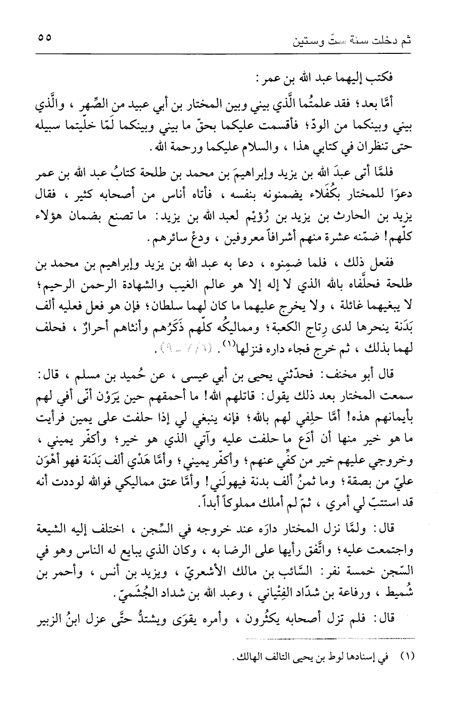 أمَّا بعد؛ فقد علمتُما الَّذي بيني وبين المختار بن أبي عبيد من الصِّهر، والَّذي بيني وبينكما من الودّ؛ فأقسمت عليكما بحقّ ما بيني وبينكما لَمّا خلّيتما سبيله حتى تنظران في كتابي هذا، والسلام عليكما ورحمة الله.