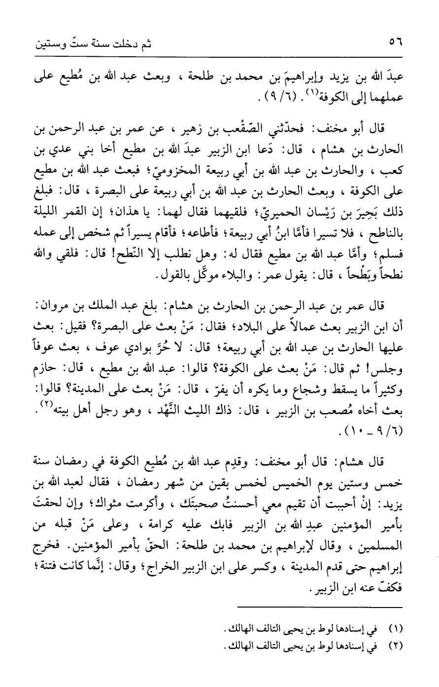 عبدَ الله بن يزيد وإبراهيمَ بن محمد بن طلحة، وبعث عبد الله بن مُطيع على عملهما إلى الكوفة (١). (٦/ ٩).