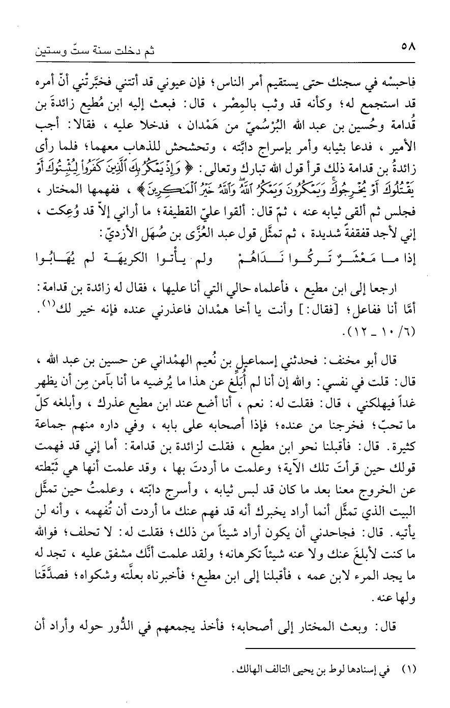 قال أبو مخنف: فحدثني إسماعيل بن نُعيم الهمْداني عن حسين بن عبد الله، قال: قلت في نفسي: والله إن أنا لم أُبَلِّغ عن هذا ما يُرضيه ما أنا بآمن مِن أن يظهر غدًا فيهلكني، قال: فقلت له: نعم، أنا أضع عند ابن مطيع عذرك، وأبلغه كلّ ما تحبّ؛ فخرجنا من عنده، فإذا أصحابه على بابه، وفي داره منهم جماعة كثيرة. قال: فأقبلنا نحو ابن مطيع، فقلت لزائدة بن قدامة: أما إني قد فهمت قولك حين قرأتَ تلك الآية؛ وعلمت ما أردتَ بها، وقد علمت أنها هي ثَبّطته عن الخروج معنا بعد ما كان قد لبس ثيابه، وأسرج دابّته، وعلمتُ حين تمثَّل البيت الذي تمثَّل أنما أراد يخبرك أنه قد فهم عنك ما أردت أن تُفهمه، وأنه لن يأتيه. قال: فجاحدني أن يكون أراد شيئًا من ذلك، فقلت له: لا تحلف؛ فوالله ما كنت لأبلغَ عنك ولا عنه شيئًا تكرهانه؛ ولقد علمت أنَّك مشفق عليه، تجد له ما يجد المرء لابن عمه، فأقبلنا إلى ابن مطيع، فأخبرناه بعلَّته وشكواه؛ فصدَّقَنا ولها عنه.