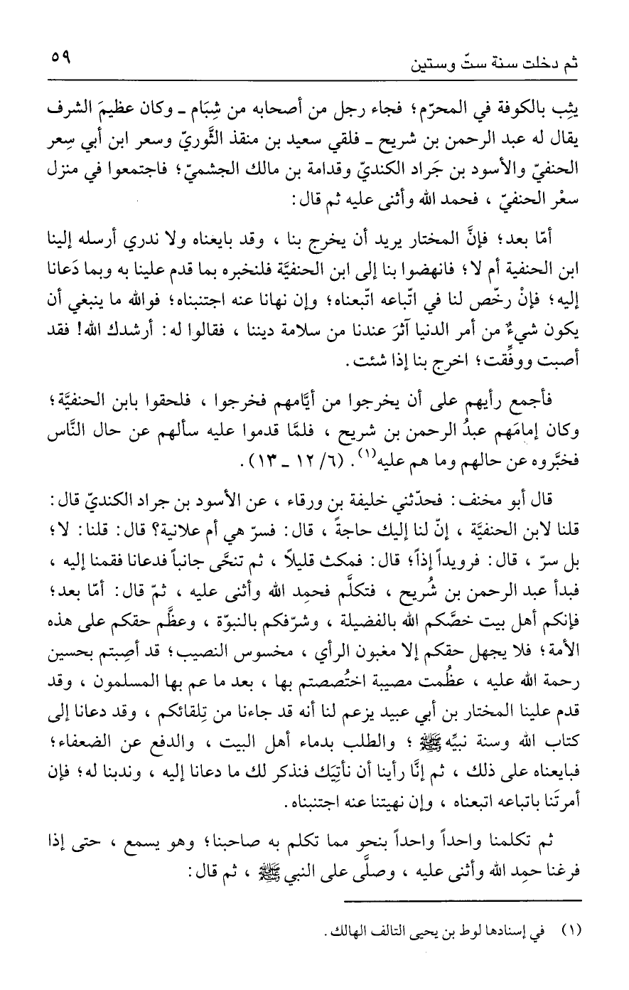 قال أبو مخنف: فحدّثني خليفة بن ورقاء، عن الأسود بن جراد الكنديّ قال: قلنا لابن الحنفيَّة، إنّ لنا إليك حاجةً، قال: فسرّ هي أم علانية؟ قال: قلنا: لا؛ بل سرّ، قال: فرويدًا إذًا؛ قال: فمكث قليلًا، ثم تنحَّى جانبًا فدعانا فقمنا إليه، فبدأ عبد الرحمن بن شُريح، فتكلَّم فحمِد الله وأثنى عليه، ثمّ قال: أمّا بعد؛ فإنكم أهل بيت خصَّكم الله بالفضيلة، وشرّفكم بالنبوّة، وعظَّم حقكم على هذه الأمة؛ فلا يجهل حقكم إلا مغبون الرأي، مخسوس النصيب؛ قد أصِبتم بحسين رحمة الله عليه، عظُمت مصيبة اختُصصتم بها، بعد ما عم بها المسلمون، وقد قدم علينا المختار بن أبي عبيد يزعم لنا أنه قد جاءنا من تِلقائكم، وقد دعانا إلى كتاب الله وسنة نبيِّه - صلى الله عليه وسلم -؛ والطلب بدماء أهل البيت، والدفع عن الضعفاء؛ فبايعناه على ذلك، ثم إنَّا رأينا أن نأتِيَك فنذكر لك ما دعانا إليه، وندبنا له؛ فإن أمرتَنا باتباعه اتبعناه، وإن نهيتنا عنه اجتنبناه.