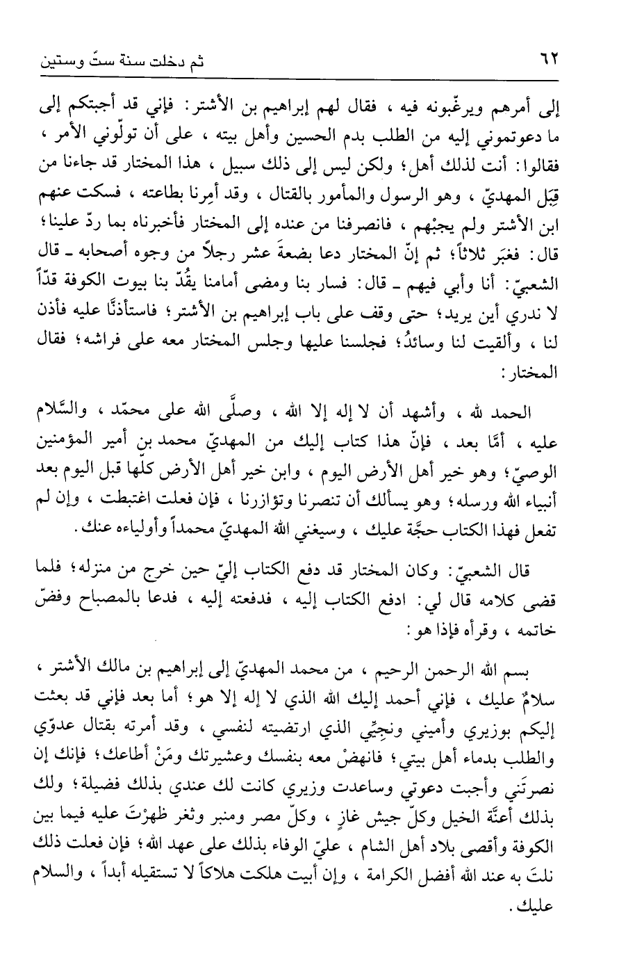 بسم الله الرحمن الرحيم، من محمد المهديّ إلى إبراهيم بن مالك الأشتر، سلامٌ عليك، فإني أحمد إليك الله الذي لا إله إلا هو؛ أما بعد فإني قد بعثت إليكم بوزيري وأميني ونجِيِّي الذي ارتضيته لنفسي، وقد أمرته بقتال عدوّي والطلب بدماء أهل بيتي؛ فانهضْ معه بنفسك وعشيرتك ومَنْ أطاعك؛ فإنك إن نصرتَني وأجبت دعوتي وساعدت وزيري كانت لك عندي بذلك فضيلة؛ ولك بذلك أعنَّة الخيل وكلّ جيش غازٍ، وكلّ مصر ومنبر وثغر ظهرْتَ عليه فيما بين الكوفة وأقصى بلاد أهل الشام، عليّ الوفاء بذلك على عهد الله؛ فإن فعلت ذلك نلتَ به عند الله أفضل الكرامة، وإن أبيت هلكت هلاكًا لا تستقيله أبدًا، والسلام عليك.