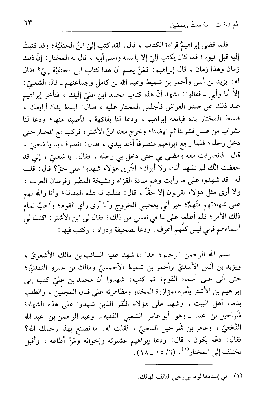 بسم الله الرحمن الرحيم؛ هذا ما شهد عليه السائب بن مالك الأشعريّ، ويزيد بن أنس الأسديّ وأحمر بن شميط الأحمسيّ ومالك بن عمرو النهديّ؛ حتى أتى على أسماء القوم؛ ثم كتب: شهدوا أن محمد بن عليّ كتب إلى إبراهيم بن الأشتر يأمره بمؤازرة المختار ومظاهرته على قتال المحِلّين، والطلب بدماء أهل البيت، وشهد على هؤلاء النَّفر الذين شهدوا على هذه الشهادة شَراحيل بن عبد - وهو أبو عامر الشعبيّ الفقيه - وعبد الرحمن بن عبد الله النَّخعيّ، وعامر بن شَراحيل الشعبيّ، فقلت له: ما تصنع بهذا رحمك الله؟ فقال: دعْه يكون، قال: ودعا إبراهيم عشيرته وإخوانه ومَنْ أطاعه، وأقبل يختلف إلى المختار (١). (٦/ ١٥ - ١٨).