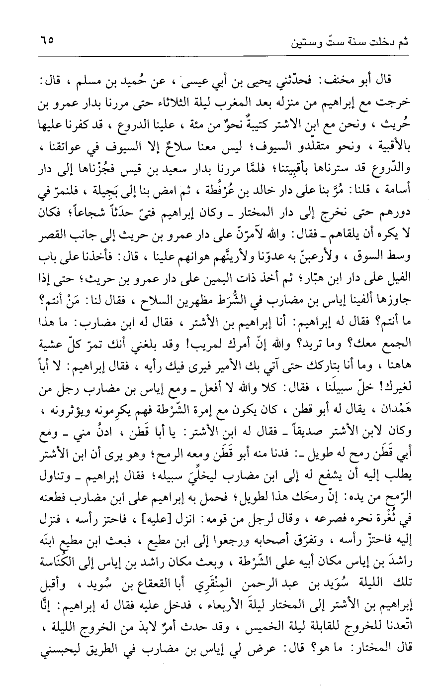 قال أبو مخنف: فحدّثني يحيى بن أبي عيسى، عن حُميد بن مسلم، قال: خرجت مع إبراهيم من منزله بعد المغرب ليلة الثلاثاء حتى مررنا بدار عمرو بن حُريث، ونحن مع ابن الأشتر كتيبةٌ نحوٌ من مئة، علينا الدروع، قد كفرنا عليها بالأقبية، ونحو متقلّدو السيوف؛ ليس معنا سلاحٌ إلا السيوف في عواتقنا، والدّروع قد سترناها بأقبِيتنا؛ فلمَّا مررنا بدار سعيد بن قيس فجُزْناها إلى دار أسامة، قلنا: مُرَّ بنا على دار خالد بن عُرْفُطة، ثم امض بنا إلى بَجِيلة، فلنمرّ في دورهم حتى نخرج إلى دار المختار - وكان إبراهيم فتىً حدَثًا شجاعًا؛ فكان لا يكره أن يلقاهم - فقال: والله لأمرّنّ على دار عمرو بن حريث إلى جانب القصر وسط السوق، ولأرعبنّ به عدوّنا ولأرينَّهم هوانهم علينا، قال: فأخذنا على باب الفيل على دار ابن هبّار؛ ثم أخذ ذات اليمين على دار عمرو بن حريث؛ حتى إذا جاوزها ألفينا إياس بن مضارب في الشُّرَط مظهرين السلاح، فقال لنا: مَنْ أنتم؟ ما أنتم؟ فقال له إبراهيم: أنا إبراهيم بن الأشتر، فقال له ابن مضارب: ما هذا الجمع معك؟ وما تريد؟ والله إنّ أمرك لمريب! وقد بلغني أنك تمرّ كلّ عشية هاهنا، وما أنا بتاركك حتى آتي بك الأمير فيرى فيك رأيه، فقال إبراهيم: لا أبًا لغيرك! خلّ سبيلَنا، فقال: كلا والله لا أفعل - ومع إياس بن مضارب رجل من هَمْدان، يقال له أبو قطن، كان يكون مع إمرة الشّرْطة فهم يكرِمونه ويؤثرونه، وكان لابن الأشتر صديقًا - فقال له ابن الأشتر: يا أبا قَطن، ادنُ مني - ومع أبي قَطَن رمح له طويل -: فدنا منه أبو قَطَن ومعه الرمح؛ وهو يرى أن ابن الأشتر يطلب إليه أن يشفع له إلى ابن مضارب ليخلِّيَ سبيله؛ فقال إبراهيم - وتناول الرّمح من يده: إنّ رمحَك هذا لطويل؛ فحمل به إبراهيم على ابن مضارب فطعنه في ثُغْرة نحره فصرعه، وقال لرجل من قومه: انزل [عليه]، فاحتز رأسه، فنزل إليه فاحتزّ رأسه، وتفرّق أصحابه ورجعوا إلى ابن مطيع، فبعث ابن مطيع ابنَه راشدَ بن إياس مكان أبيه على الشرْطة، وبعث مكان راشد بن إياس إلى الكُنَاسة تلك الليلة سُوَيد بن عبد الرحمن المِنْقَرِي أبا القعقاع بن سُويد، وأقبل إبراهيم بن الأشتر إلى المختار ليلةَ الأربعاء، فدخل عليه فقال له إبراهيم: إنَّا اتّعدنا للخروج للقابلة ليلة الخميس، وقد حدث أمرٌ لابدّ من الخروج الليلة، قال المختار: ما هو؟ قال: عرض لي إياس بن مضارب في الطريق ليحبسني
