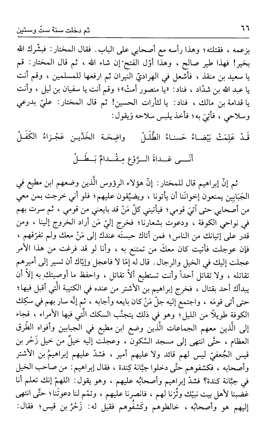 بزعمه، فقتلته؛ وهذا رأسه مع أصحابي على الباب. فقال المختار: فبشّرك الله بخير! فهذا طير صالح، وهذا أوّل الفتح إن شاء الله، ثم قال المختار: قم يا سعيد بن منقذ، فأشعل في الهراديّ النيران ثم ارفعها للمسلمين، وقم أنت يا عبد الله بن شدّاد، فناد: "يا منصور أمتْ"؟ وقم أنت يا سفيان بن ليل، وأنت يا قدامة بن مالك، فناد: يا لثأرات الحسين! ثم قال المختار: عليّ بدرعي وسلاحي، فأتِيَ به؛ فأخذ يلبس سلاحه وَيقول: