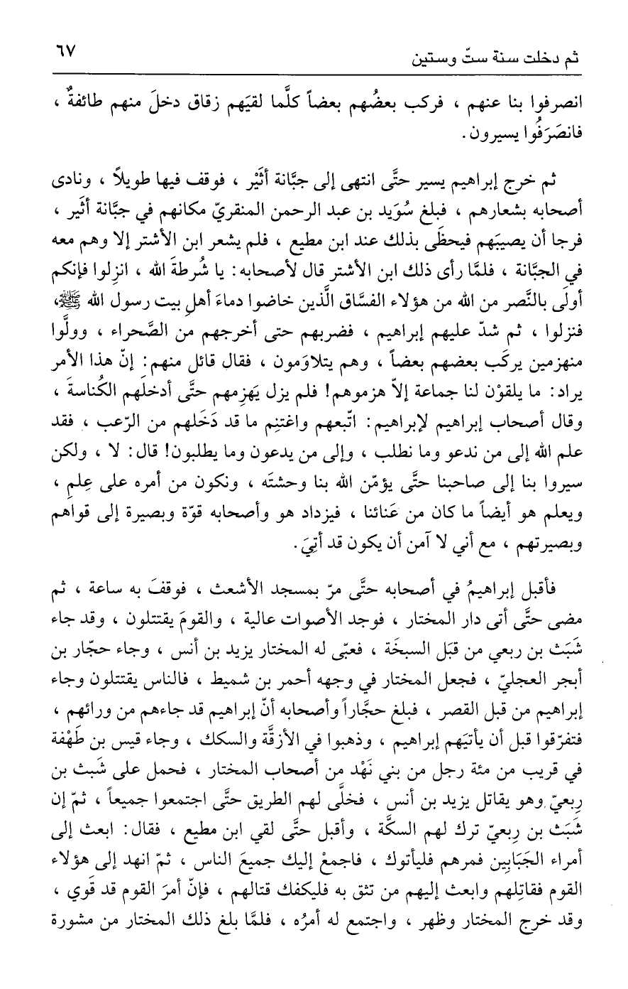 فأقبل إبراهيمُ في أصحابه حتَّى مرّ بمسجد الأشعث، فوقفَ به ساعة، ثم مضى حتَّى أتى دار المختار، فوجد الأصوات عالية، والقومَ يقتتلون، وقد جاء شَبَث بن ربعي من قبَل السبخَة، فعبّى له المختار يزيد بن أنس، وجاء حجّار بن أبجر العجليّ، فجعل المختار في وجهه أحمر بن شميط، فالناس يقتتلون وجاء إبراهيم من قبل القصر، فبلغ حجَّارًا وأصحابه أنّ إبراهيم قد جاءهم من ورائهم، فتفرّقوا قبل أن يأتيَهم إبراهيم، وذهبوا في الأزقَّة والسكك، وجاء قيس بن طَهْفة في قريب من مئة رجل من بني نَهْد من أصحاب المختار، فحمل على شَبث بن رِبعيّ وهو يقاتل يزيد بن أنس، فخلَّى لهم الطريق حتَّى اجتمعوا جميعًا، ثمّ إن شَبَث بن رِبعيّ ترك لهم السكَّة، وأقبل حتَّى لقي ابن مطيع، فقال: ابعث إلى أمراء الجَبَابِين فمرهم فليأتوك، فاجمعْ إليك جميعَ الناس، ثمّ انهد إلى هؤلاء القوم فقاتِلهم وابعث إليهم من تثق به فليكفك قتالهم، فإنّ أمرَ القوم قد قَوي، وقد خرج المختار وظهر، واجتمع له أمرُه، فلمَّا بلغ ذلك المختار من مشورة