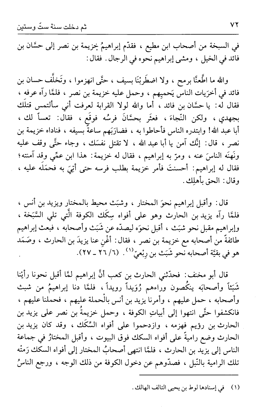 قال: وأقبل إبراهيم نحوَ المختار، وشبَث محيط بالمختار ويزيد بن أنس، فلمَّا رآه يزيد بن الحارث وهو على أفواه سِكَك الكوفة الَّتي تلي السَّبَخة، وإبراهيم مقبل نحو شبَث، أقبل نحوَه ليصدّه عن شَبَث وأصحابه، فبعث إبراهيم طائفةً من أصحابه مع خزيمة بن نصر، فقال: أغْنِ عنا يزيدَ بن الحارث، وصَمَد هو في بقيَّة أصحابه نحو شَبَث بن رِبْعيّ (١). (٦/ ٢٦ - ٢٧).