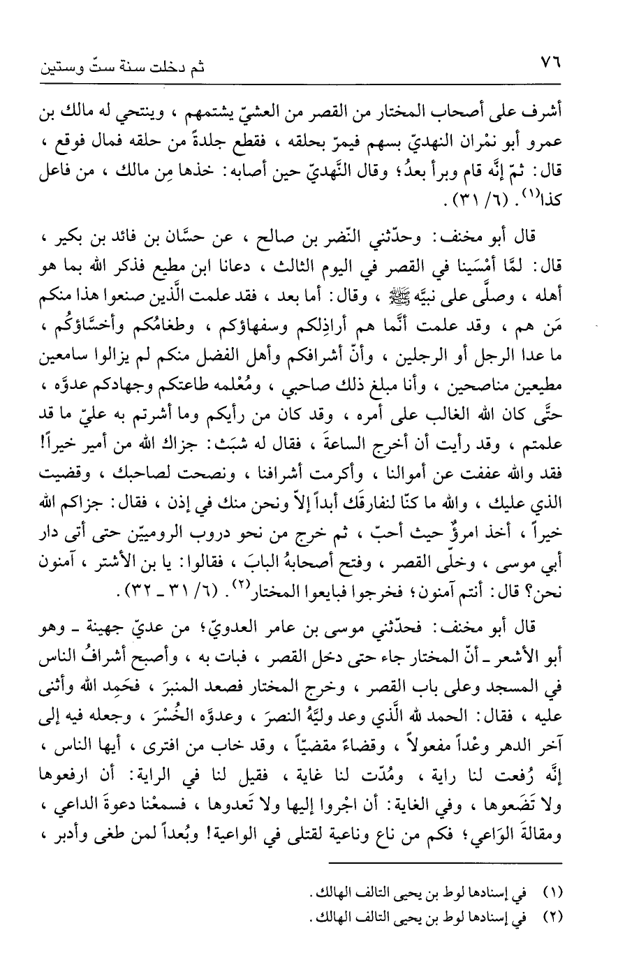 قال أبو مخنف: وحدّثني النّضر بن صالح، عن حسَّان بن فائد بن بكير، قال: لمَّا أمْسَينا في القصر في اليوم الثالث، دعانا ابن مطيع فذكر الله بما هو أهله، وصلَّى على نبيَّه - صلى الله عليه وسلم -، وقال: أما بعد، فقد علمت الَّذين صنعوا هذا منكم مَن هم، وقد علمت أنَّما هم أراذِلكم وسفهاؤكم، وطغامُكم وأخسَّاؤكُم، ما عدا الرجل أو الرجلين، وأنّ أشرافكم وأهل الفضل منكم لم يزالوا سامعين مطيعين مناصحين، وأنا مبلغ ذلك صاحبي، ومُعْلمه طاعتكم وجهادكم عدوَّه، حتَّى كان الله الغالب على أمره، وقد كان من رأيكم وما أشرتم به عليّ ما قد علمتم، وقد رأيت أن أخرج الساعةَ، فقال له شبَث: جزاك الله من أمير خيرًا! فقد والله عففت عن أموالنا، وأكرمت أشرافنا، ونصحت لصاحبك، وقضيت الذي عليك، والله ما كنّا لنفارقَك أبدًا إلّا ونحن منك في إذن، فقال: جزاكم الله خيرًا، أخذ امرؤٌ حيث أحبّ، ثم خرج من نحو دروب الرومييّن حتى أتى دار أبي موسى، وخلّى القصر، وفتح أصحابهُ البابَ، فقالوا: يا بن الأشتر، آمنون نحن؟ قال: أنتم آمنون؛ فخرجوا فبايعوا المختار (٢). (٦/ ٣١ - ٣٢).