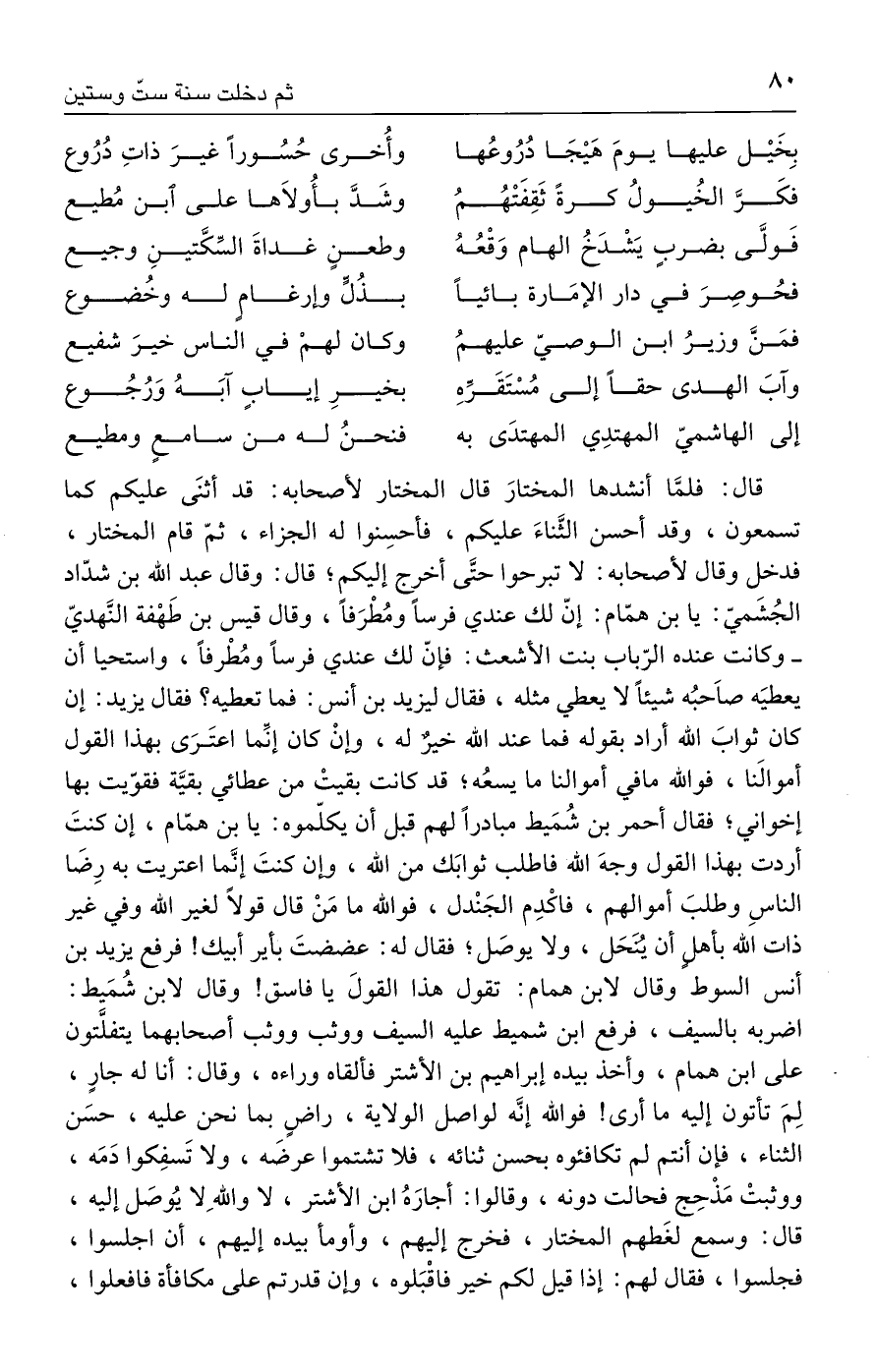 قال: فلمَّا أنشدها المختارَ قال المختار لأصحابه: قد أثنَى عليكم كما تسمعون، وقد أحسن الثَّناءَ عليكم، فأحسِنوا له الجزاء، ثمّ قام المختار، فدخل وقال لأصحابه: لا تبرحوا حتَّى أخرج إليكم؛ قال: وقال عبد الله بن شدّاد الجُشَميّ: يا بن همّام: إنّ لك عندي فرسًا ومُطْرَفًا، وقال قيس بن طَهْفة النَّهديّ - وكانت عنده الرّباب بنت الأشعث: فإنّ لك عندي فرسًا ومُطْرفًا، واستحيا أن يعطيَه صَاحبُه شيئًا لا يعطي مثله، فقال ليزيد بن أنس: فما تعطيه؟ فقال يزيد: إن كان ثوابَ الله أراد بقوله فما عند الله خيرٌ له، وإنْ كان إنَّما اعتَرَى بهذا القول أموالَنا، فوالله ما في أموالنا ما يسعُه؛ قد كانت بقيتْ من عطائي بقيَّة فقوّيت بها إخواني؛ فقال أحمر بن شُمَيط مبادرًا لهم قبل أن يكلّموه: يا بن همّام، إن كنتَ أردت بهذا القول وجهَ الله فاطلب ثوابَك من الله، وإن كنتَ إنَّما اعتريت به رِضَا الناسِ وطلبَ أموالهم، فاكْدِم الجَنْدل، فوالله ما مَنْ قال قولًا لغير الله وفي غير ذات الله بأهلٍ أن ينحَل، ولا يوصَل؛ فقال له: عضضتَ بأير أبيك! فرفع يزيد بن أنس السوط وقال لابن همام: تقول هذا القولَ يا فاسق! وقال لابن شُمَيط: اضربه بالسيف، فرفع ابن شميط عليه السيف ووثب ووثب أصحابهما يتفلَّتون على ابن همام، وأخذ بيده إبراهيم بن الأشتر فألقاه وراءه، وقال: أنا له جارٍ، لِمَ تأتون إليه ما أرى! فوالله إنَّه لواصل الولاية، راضٍ بما نحن عليه، حسَن الثناء، فإن أنتم لم تكافئوه بحسن ثنائه، فلا تشتموا عرضَه، ولا تَسفِكوا دَمَه، ووثبتْ مَذْحِج فحالت دونه، وقالوا: أجارَهُ ابن الأشتر، لا واللهِ لا يُوصَل إليه، قال: وسمع لغَطهم المختار، فخرج إليهم، وأومأ بيده إليهم، أن اجلسوا، فجلسوا، فقال لهم: إذا قيل لكم خير فاقْبَلوه، وإن قدرتم على مكافأة فافعلوا،