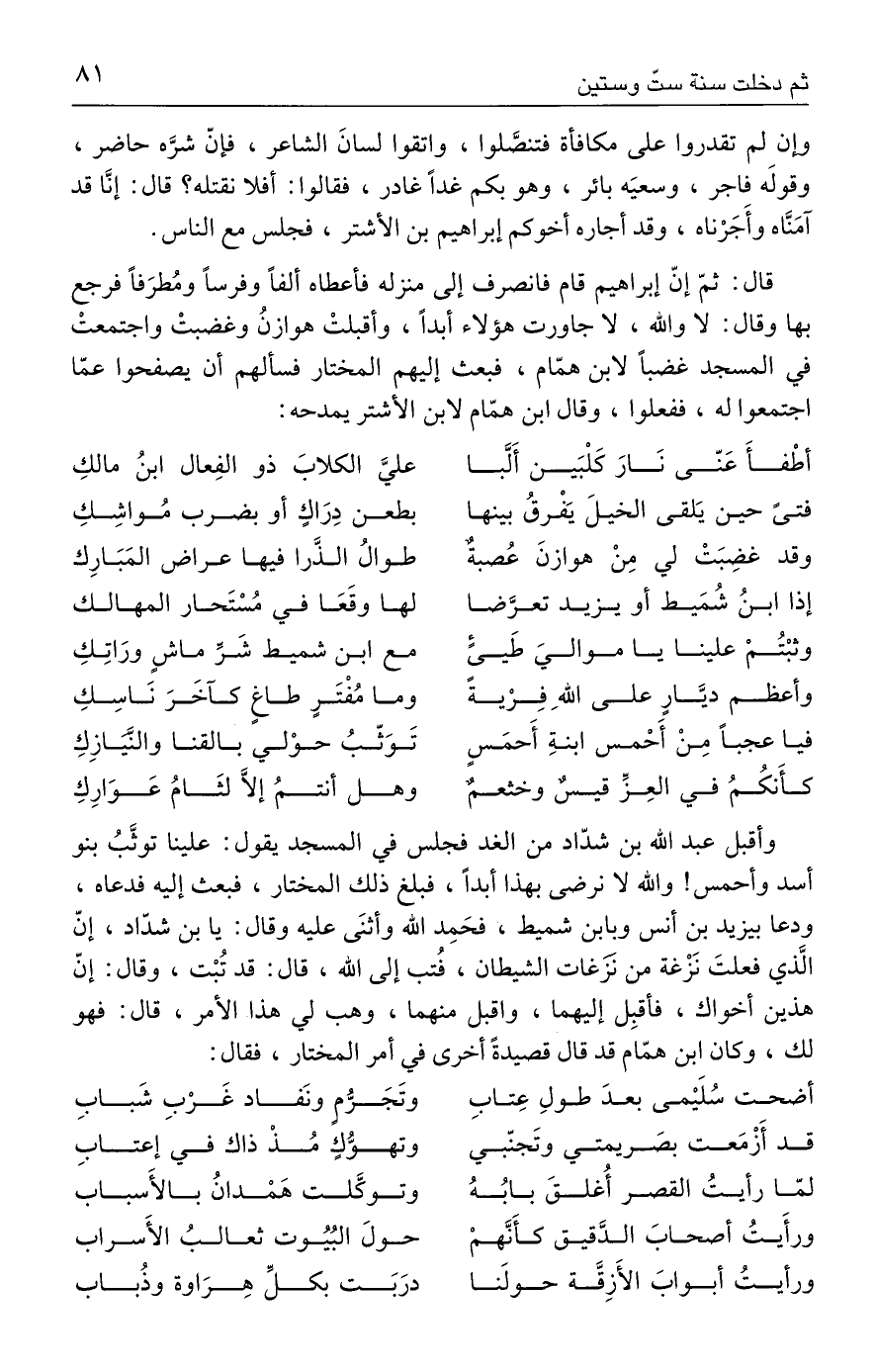قال: ثمّ إنّ إبراهيم قام فانصرف إلى منزله فأعطاه ألفًا وفرسًا ومُطرَفًا فرجع بها وقال: لا والله، لا جاورت هؤلاء أبدًا، وأقبلتْ هوازنُ وغضبتْ واجتمعتْ في المسجد غضبًا لابن همّام، فبعث إليهم المختار فسألهم أن يصفحوا عمّا اجتمعوا له، ففعلوا، وقال ابن همّام لابن الأشتر يمدحه: