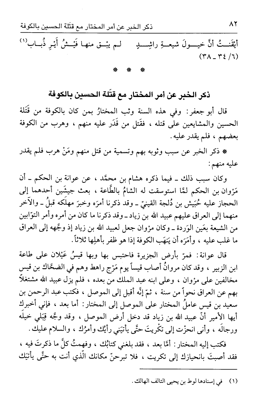 قال أبو جعفر: وفي هذه السنة وثب المختارُ بمن كان بالكوفة من قَتَلة الحسين والمشايعين على قتله، فقَتل من قَدَر عليه منهم، وهرب من الكوفة بعضهم، فلم يقدر عليه.