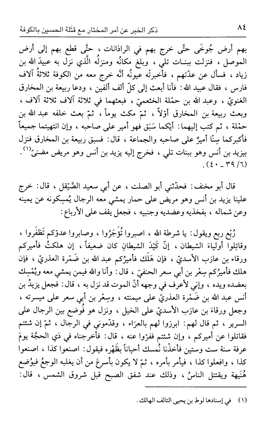 رُبْع ربع ويقول: يا شرطة الله، اصبروا تُؤجَرُوا، وصابروا عدوّكم تَظفَروا، وقاتِلوا أولياءَ الشيطان، إنّ كَيْدَ الشيطانِ كان ضعيفًا، إن هلكتُ فأميركم ورقاء بن عازب الأسديّ، فإن هَلَك فأميرُكم عبد الله بن ضَمْرة العذريّ، فإن هلك فأميرُكم سِعْر بن أبي سعر الحنفيّ، قال: وأنا والله فيمن يمشي معه ويُمْسِك بعضده ويده، وإني لأعرف في وجهه أنّ الموت قد نزل به، قال: فجعل يزيدُ بن أنس عبد الله بن ضَمْرة العذريّ على ميمنته، وسِعْر بن أبي سعر على ميسرته، وجعل ورقاءَ بن عازب الأسديّ على الخيل، ونزل هو فوُضع بين الرجال على السرير، ثم قال لهم: ابرزوا لهم بالعرَاء، وقدّموني في الرجال، ثمّ إن شئتم فقاتلوا عن أميركم، وإن شئتم ففرّوا عنه، قال: فأخرجناه في ذي الحجَّة يومَ عرفة سنة ست وستين فأخذْنا نُمسك أحيانًا بظَهْره فيقول: اصنعوا كذا، اصنعوا كذا، وافعلوا كذا، فيأمر بأمره، ثمّ لا يكون بأسرعَ من أن يغلبه الوجعُ فيوُضع هُنَيهة ويقتتل الناسُ، وذلك عند شفق الصبح قبل شروق الشمس، قال: